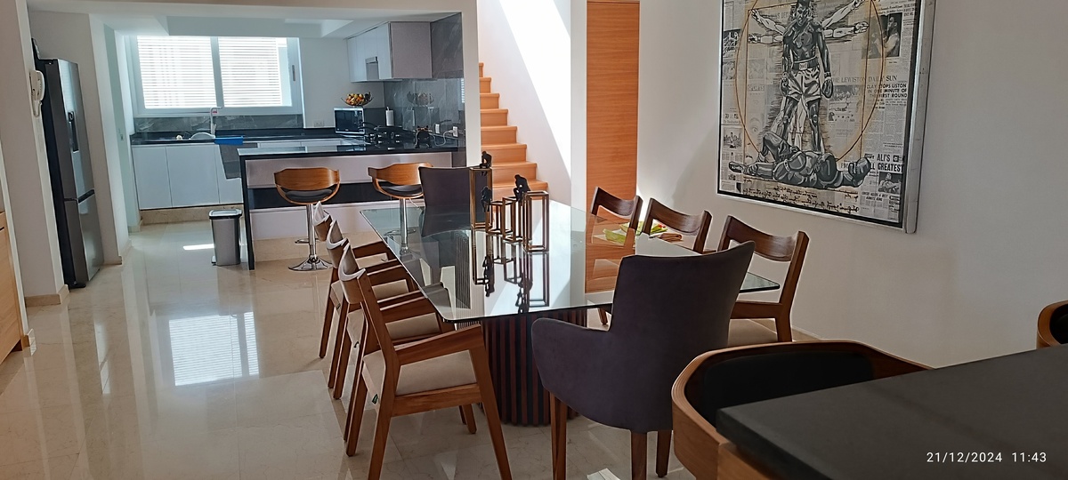 Cuenta con dos pisos, en planta baja cocina con barra, amplio comedor y estudio abierto con mucha luz natural, así como 4ta recamara con baño privado.