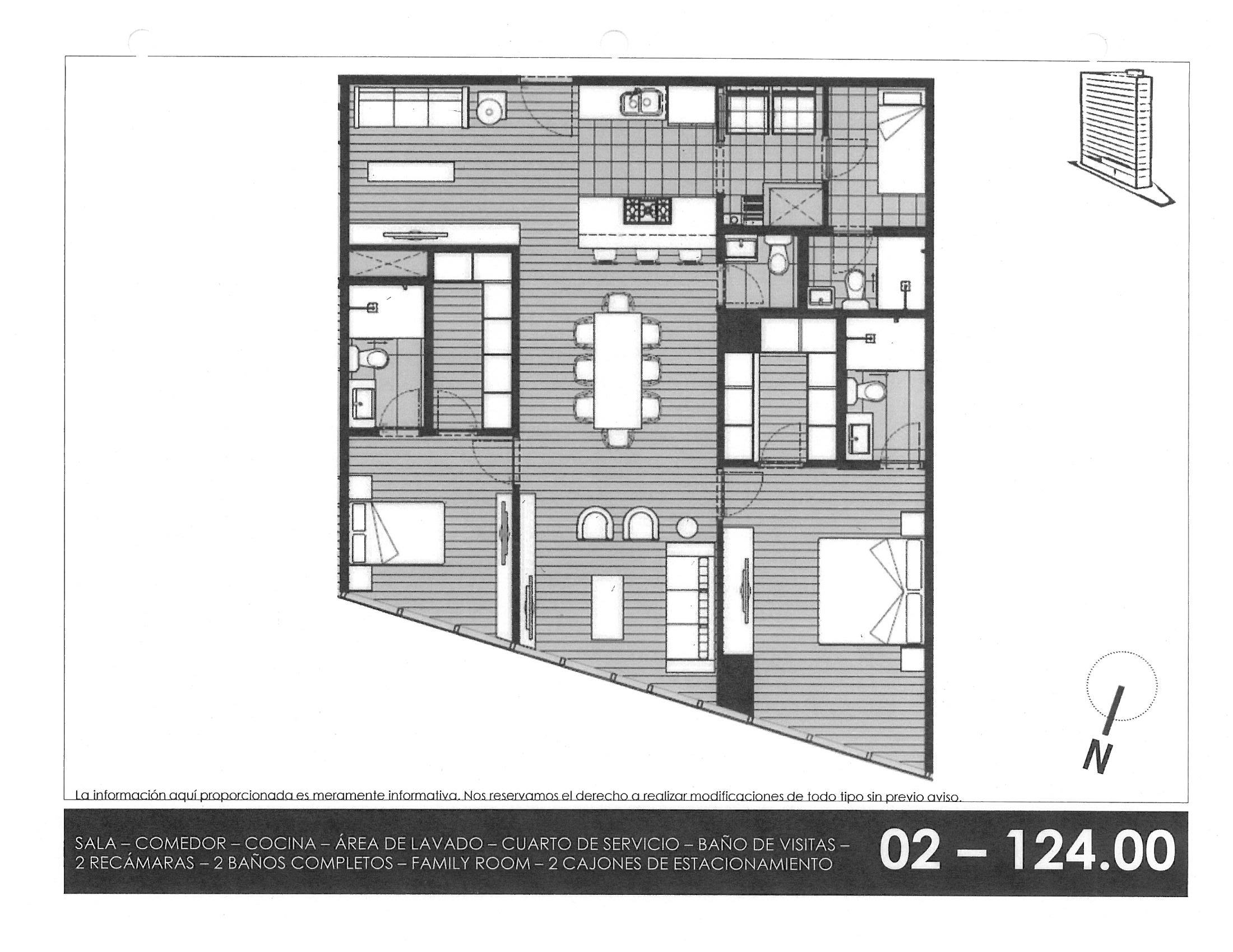 BEAUTIFUL APARTMENT IN PERFECT CONDITION. FULLY FURNISHED AND EQUIPPED. SUPER GOOD DISTRIBUTION. 124 M2. 2 BEDROOMS EACH WITH A FULL BATHROOM AND DRESSING ROOM. GUEST BATHROOM. FAMILY ROOM. SERVICE ROOM. LAUNDRY AREA. NICE OPEN KITCHEN. SPACIOUS LIVING-DINING ROOM. EXTERIOR VIEW WITH LARGE WINDOWS. VERY BRIGHT. HIGH-QUALITY FINISHES. VERY QUIET TOWER. 2 PARKING SPACES. 24-HOUR SECURITY. COMPLETE SET OF AMENITIES. PERFECT LOCATION.PRECIOSO DEPARTAMENTO EN PERFECTO ESTADO. TOTALMENTE AMUEBLADO Y EQUIPADO. SUPER BUENA DISTRIBUCION. 124 M2. 2 RECAMARAS CADA UNA CON BAÑO COMPLETO Y VESTIDOR. BAÑO DE VISITAS. FAMILY ROOM. CUARTO DE SERVICIO. AREA DE LAVADO. LINDA COCINA ABIERTA. AMPLIA SALA COMEDOR. VISTA EXTERIOR CON AMPLIOS VENTANALES. MUY LUMINOSO. ACABADOS DE ALTA CALIDAD. TORRE MUY TRANQUILA. 2 CAJONES DE ESTACIONAMIENTO. VIGILANCIA 24 HORAS. COMPLETO CONJUNTO DE AMENIDADES. PERFECTA UBICACION.