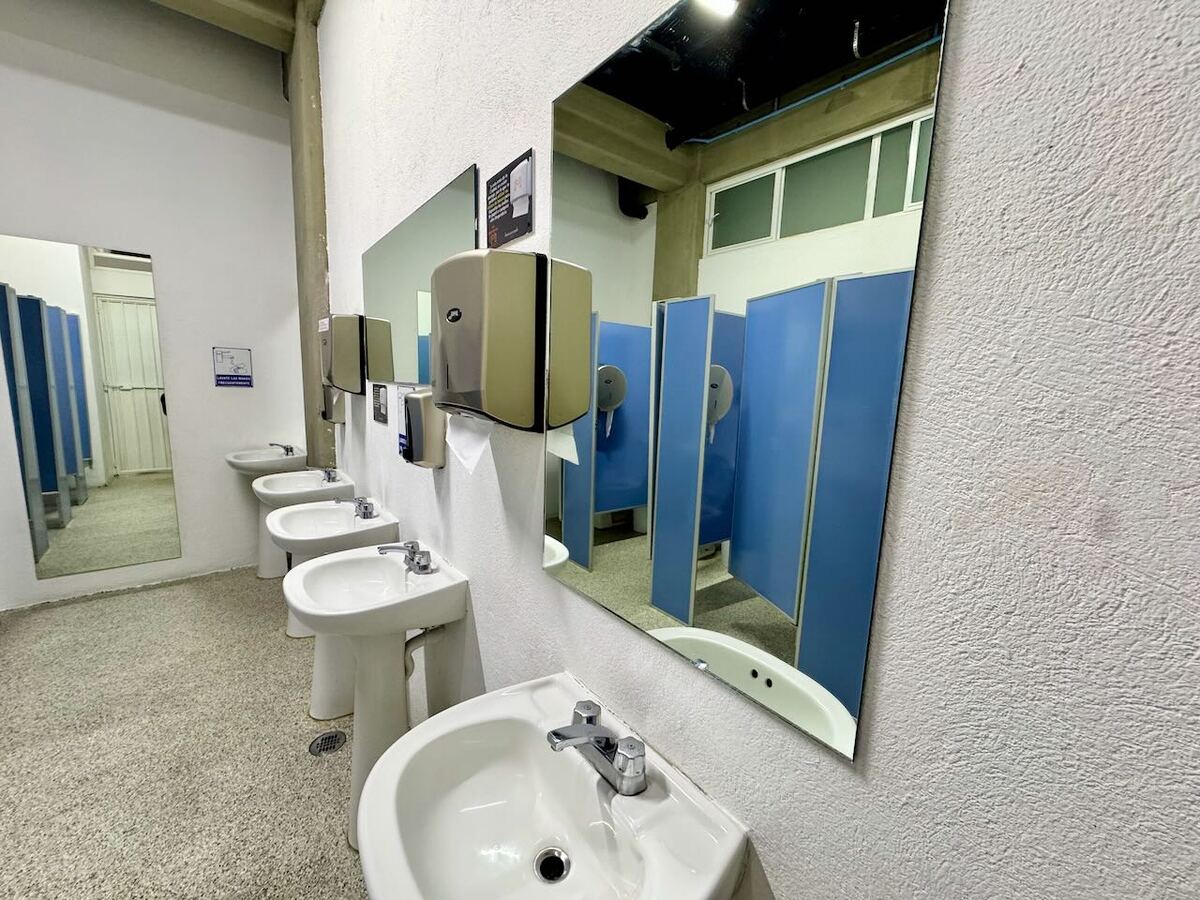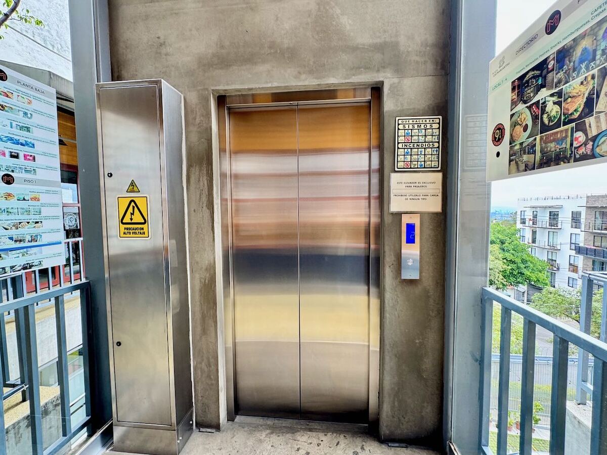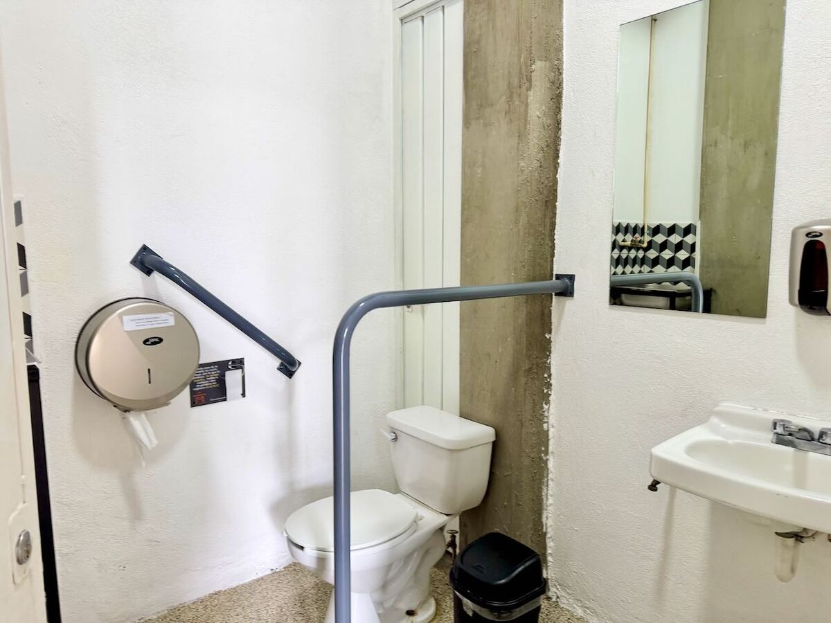 Baños: Ubicados en cada entrepiso, equipados con mingitorios y sanitarios adaptados para personas con discapacidad.