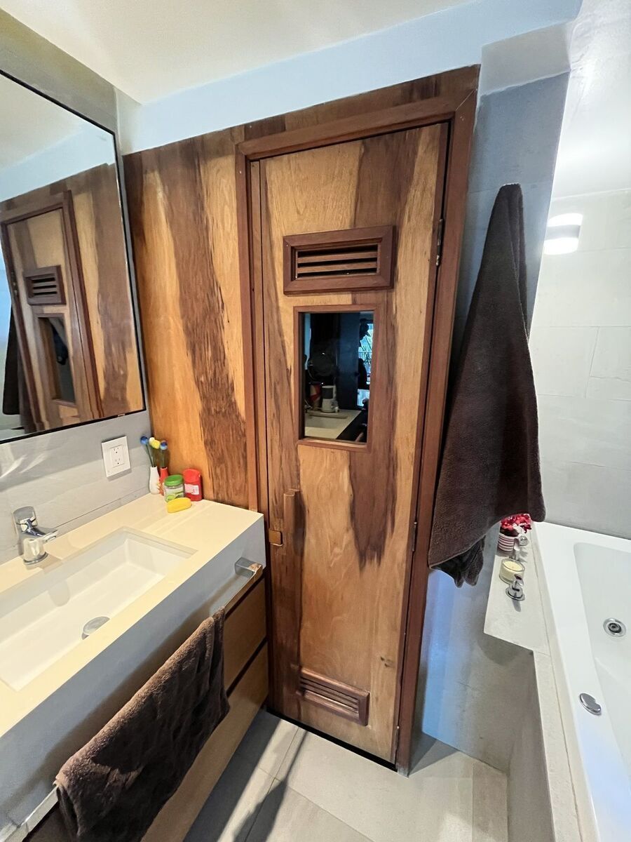 Habitación principal con baño completo (tina y sauna), vestidor y salida al balcón de la estancia