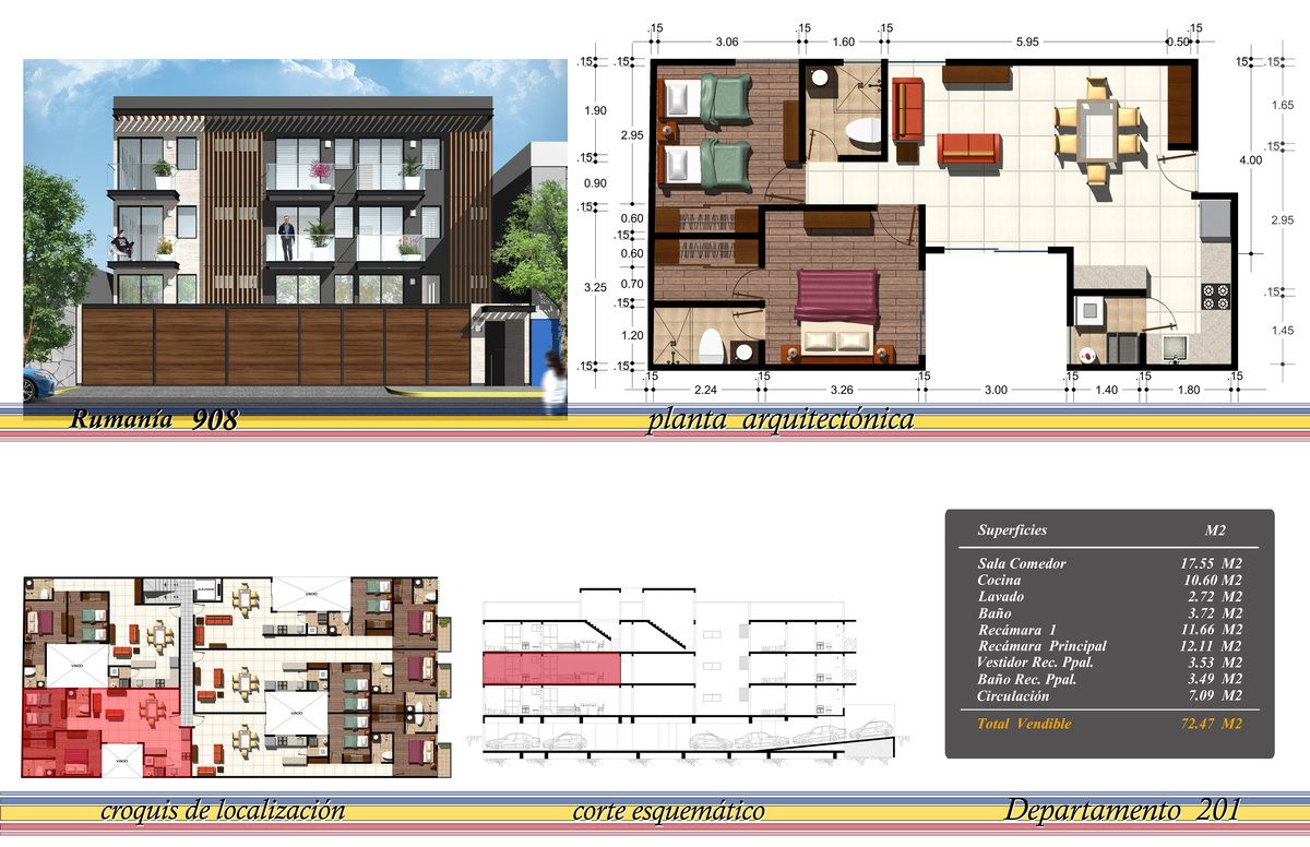 15 departamentos, edificio de 3 niveles con 5 departamentos por piso .