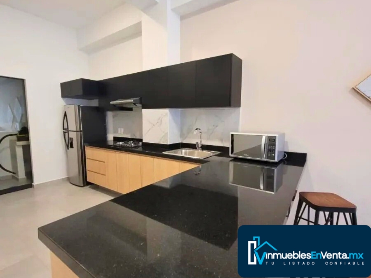 Nuestros acabados de alta calidad están presentes en todos los rincones del departamento, especialmente en la cocina equipada con cocinas interiores de melamina en blanco y frentes texturizados en maple claro, una cubierta de granito natural en color gris oscuro y los electrodomésticos que necesitas para preparar deliciosas comidas.