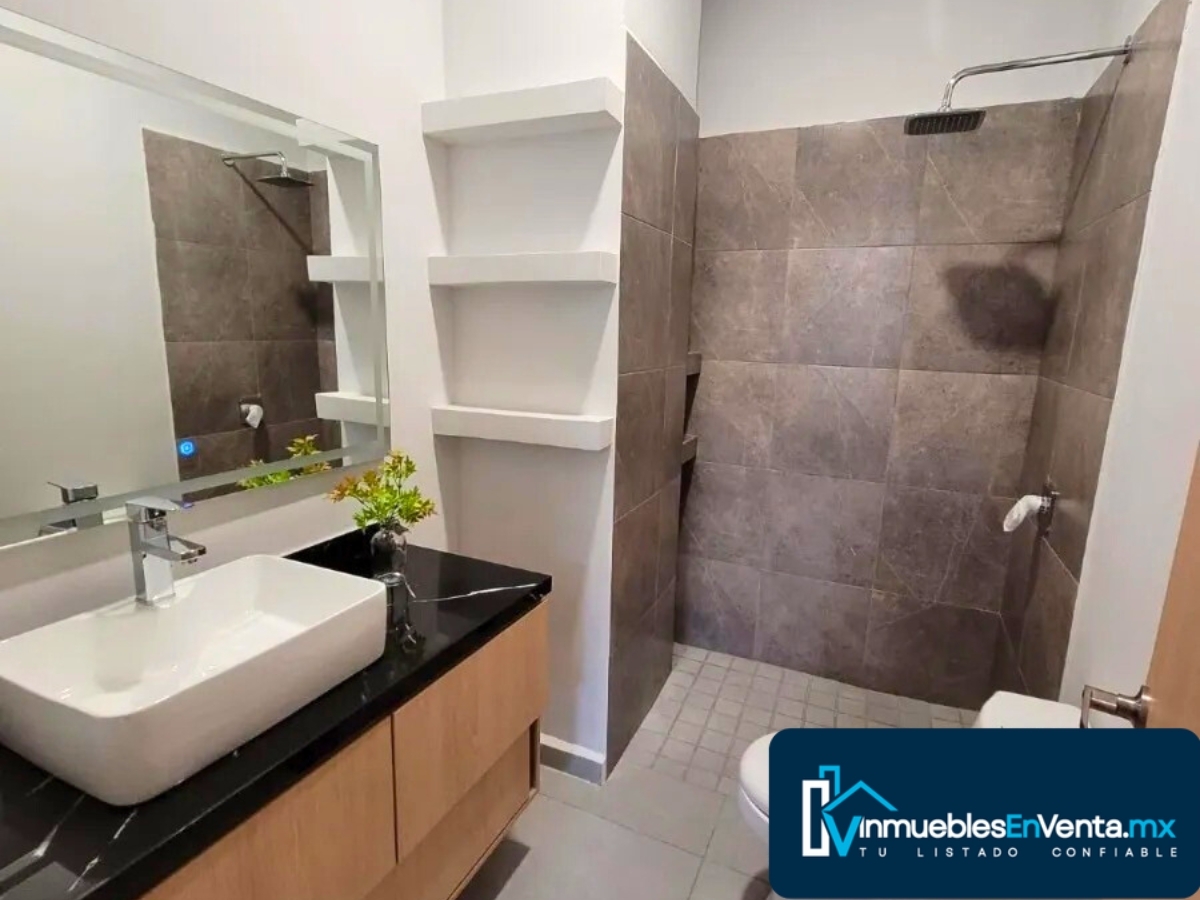 Los baños tienen un mueble bajo lavabo de melamina texturizada, bisagras bidimensionales y cubierta de granito natural modelo Slim. Los closets de melamina texturizada de 15 mm en color maple claro tienen correderas de extensión, jaladeras de aluminio y puertas corredizas.
