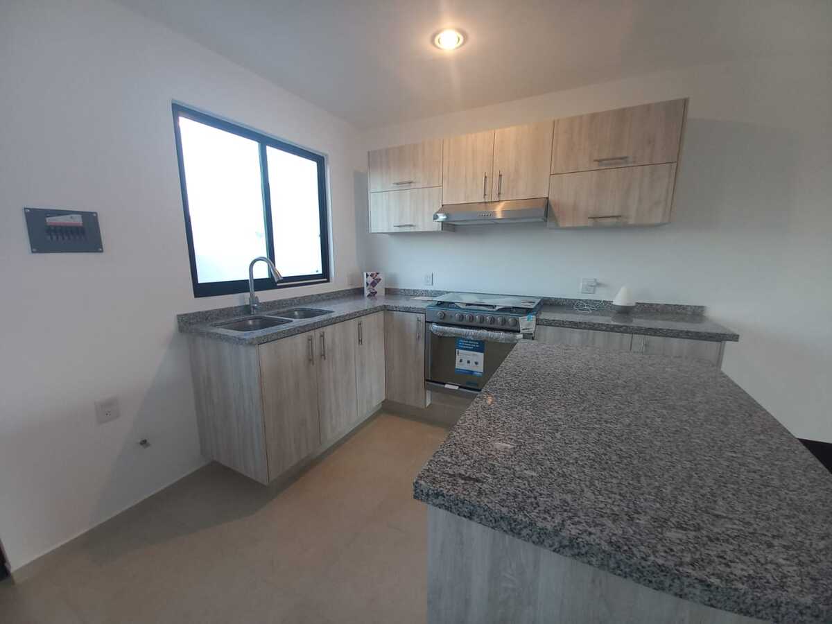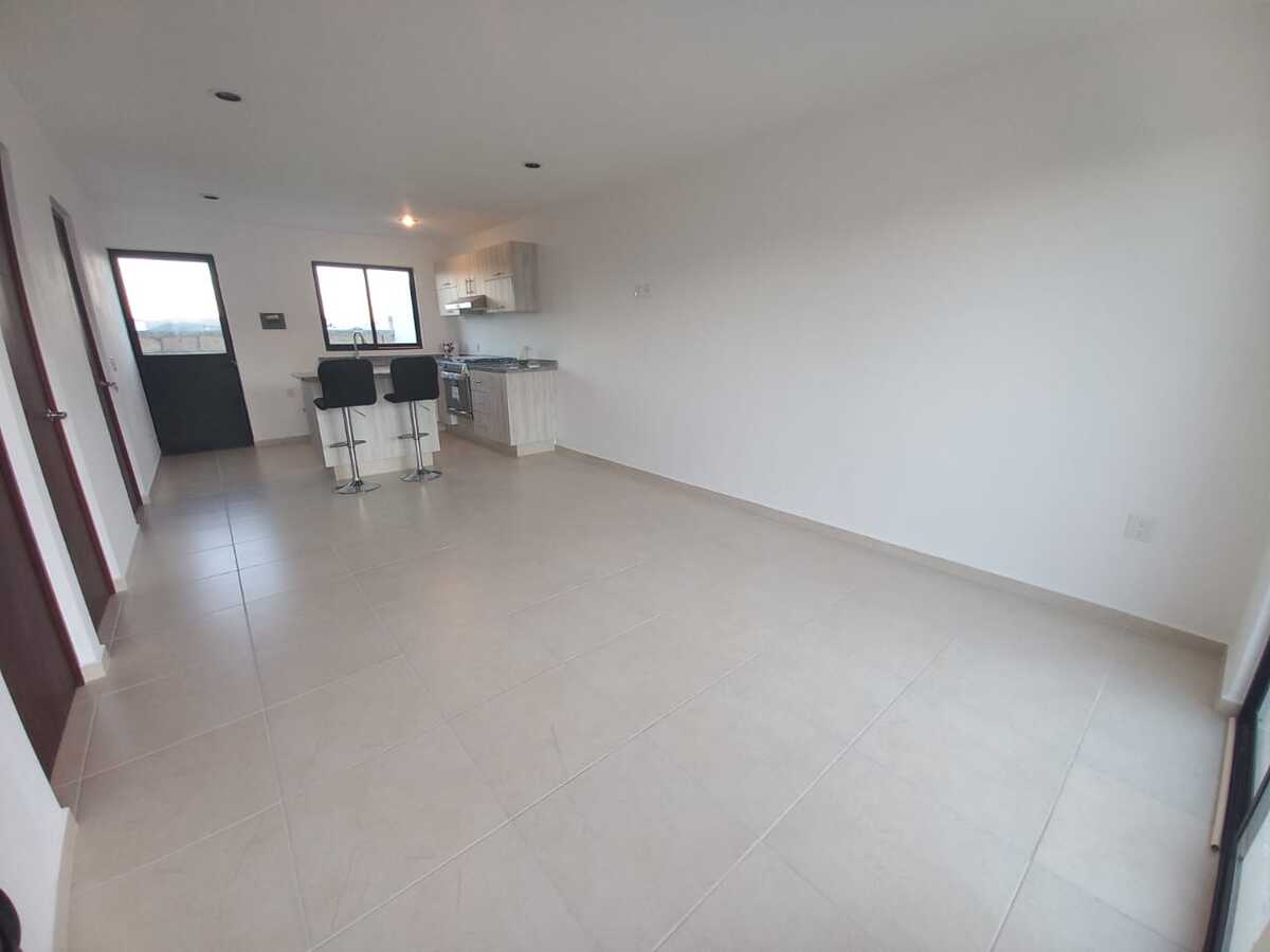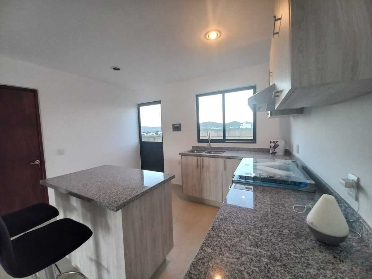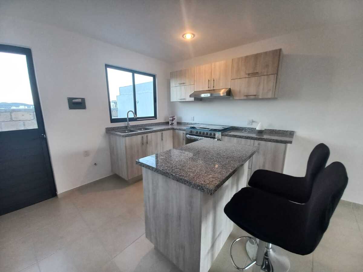 Sala, comedor, cocina equipada con isla y cubierta de barra de granito (estufa y campana de acero inoxidable), 2 recámaras cada una con baño completo (canceles de cristal templado) y closets empotrados de piso a techo y de pared a pared, medio baño de visitas