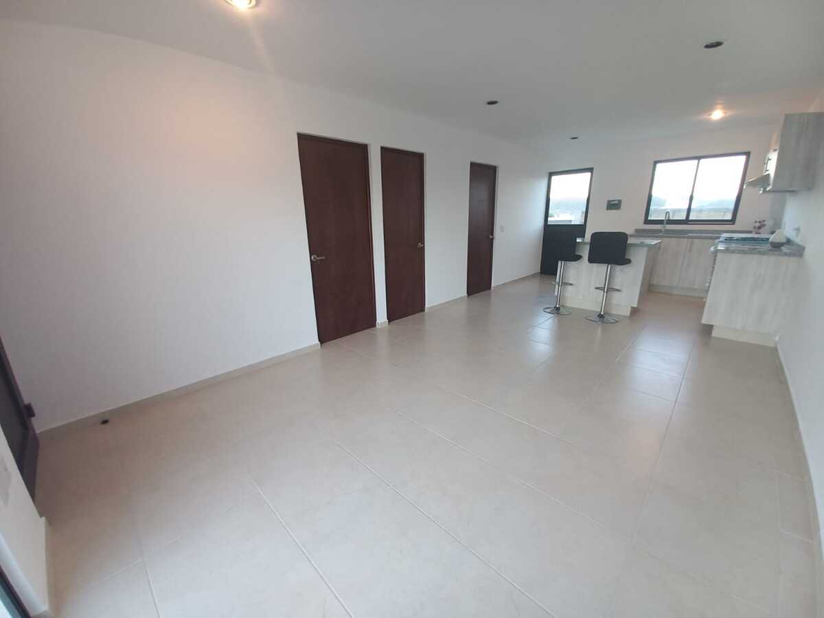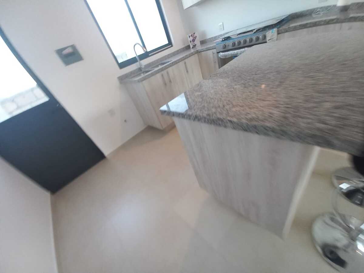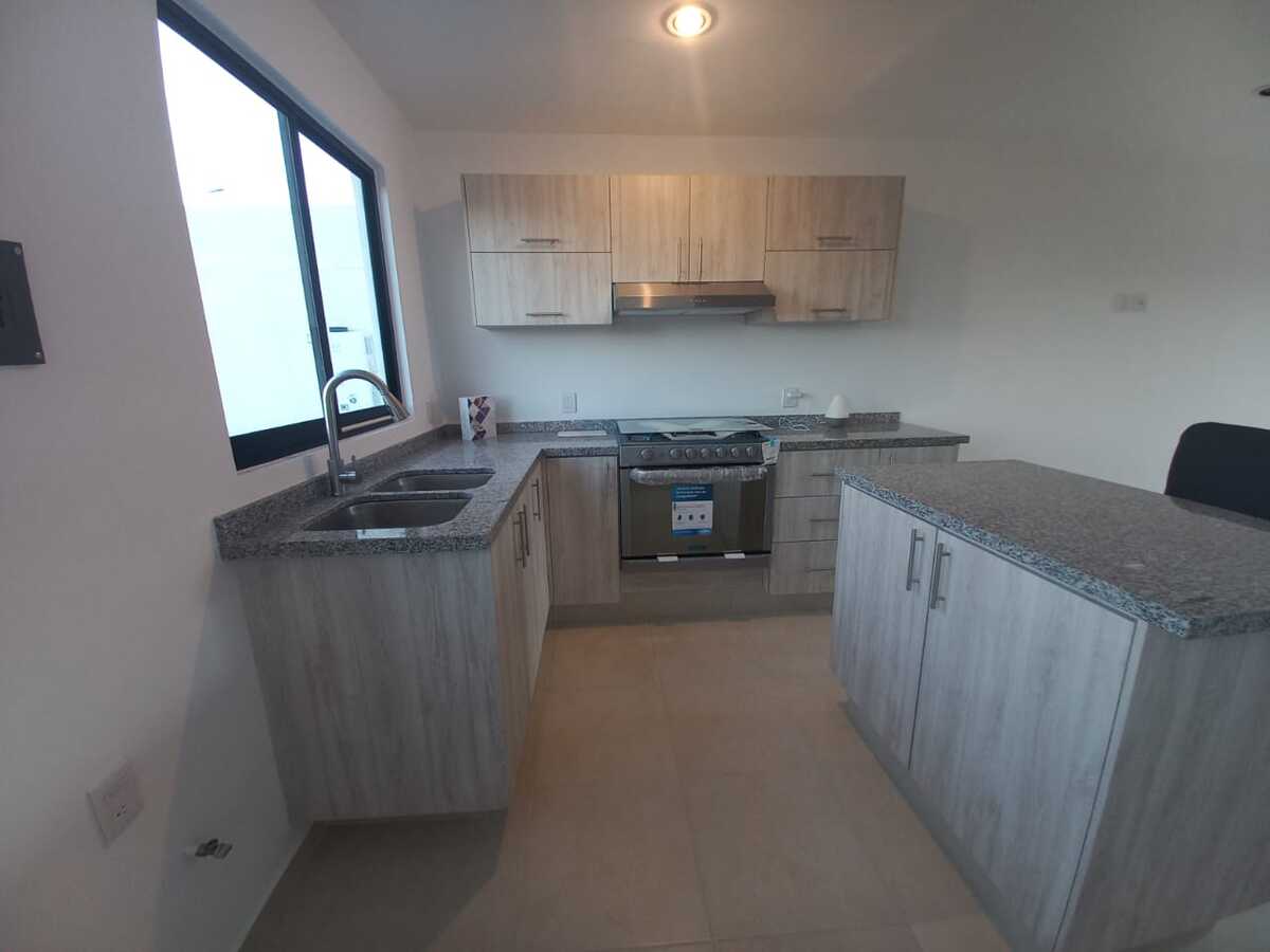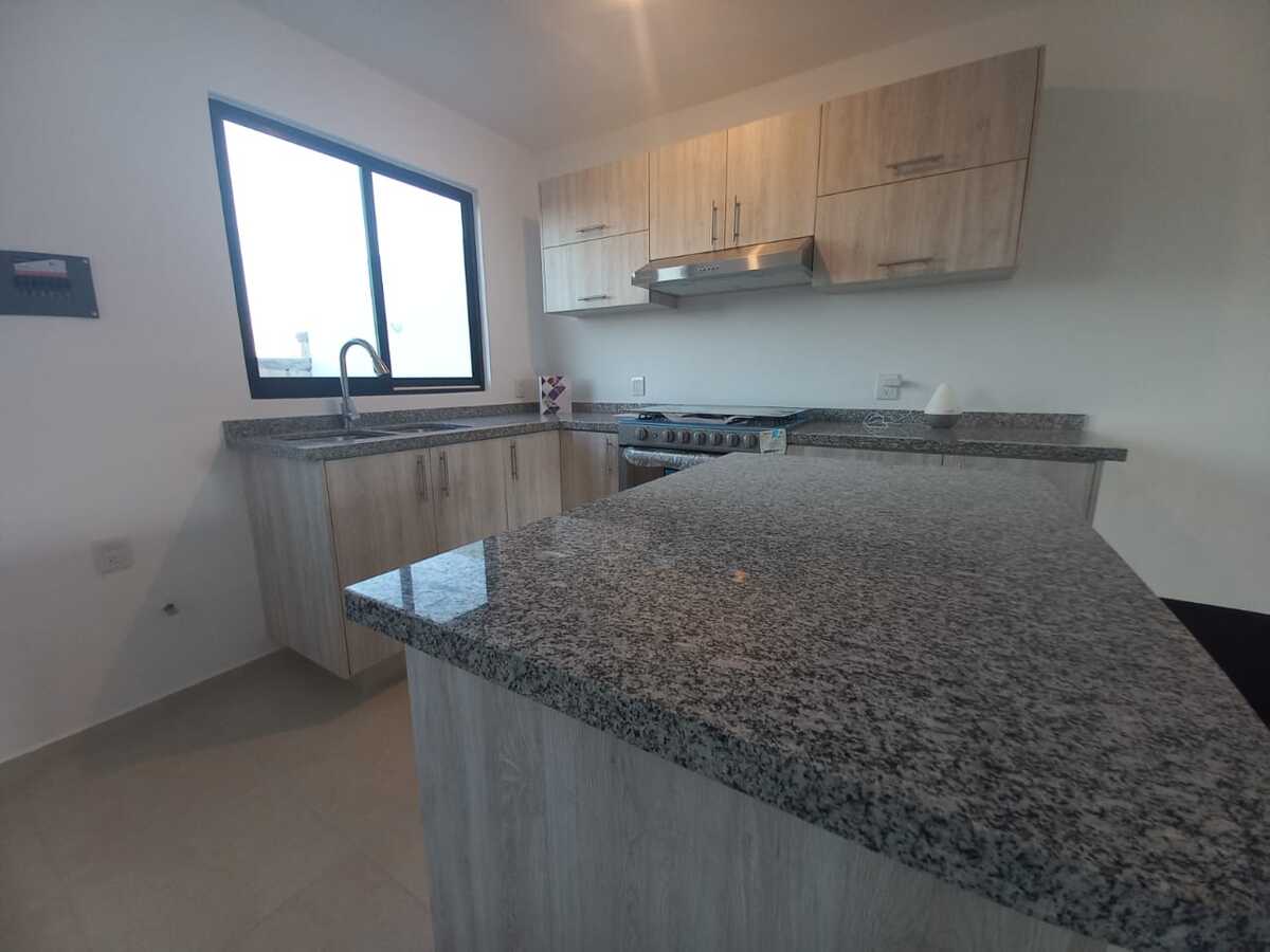 Sala, comedor, cocina equipada con isla y cubierta de barra de granito (estufa y campana de acero inoxidable), 2 recámaras cada una con baño completo (canceles de cristal templado) y closets empotrados de piso a techo y de pared a pared, medio baño de visitas
