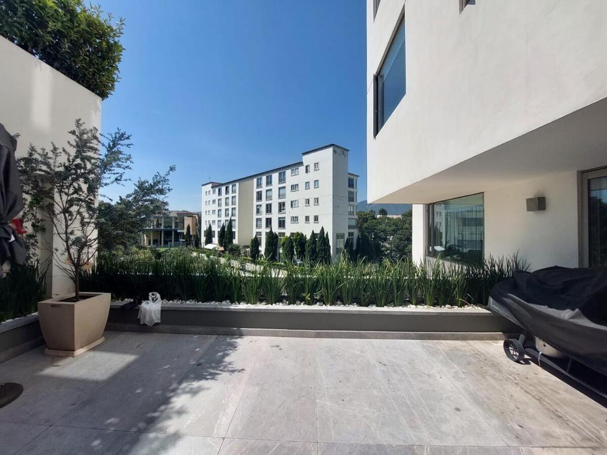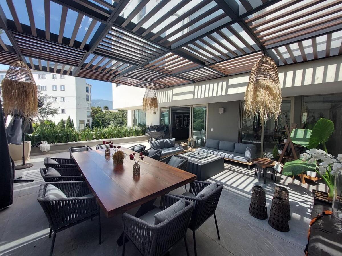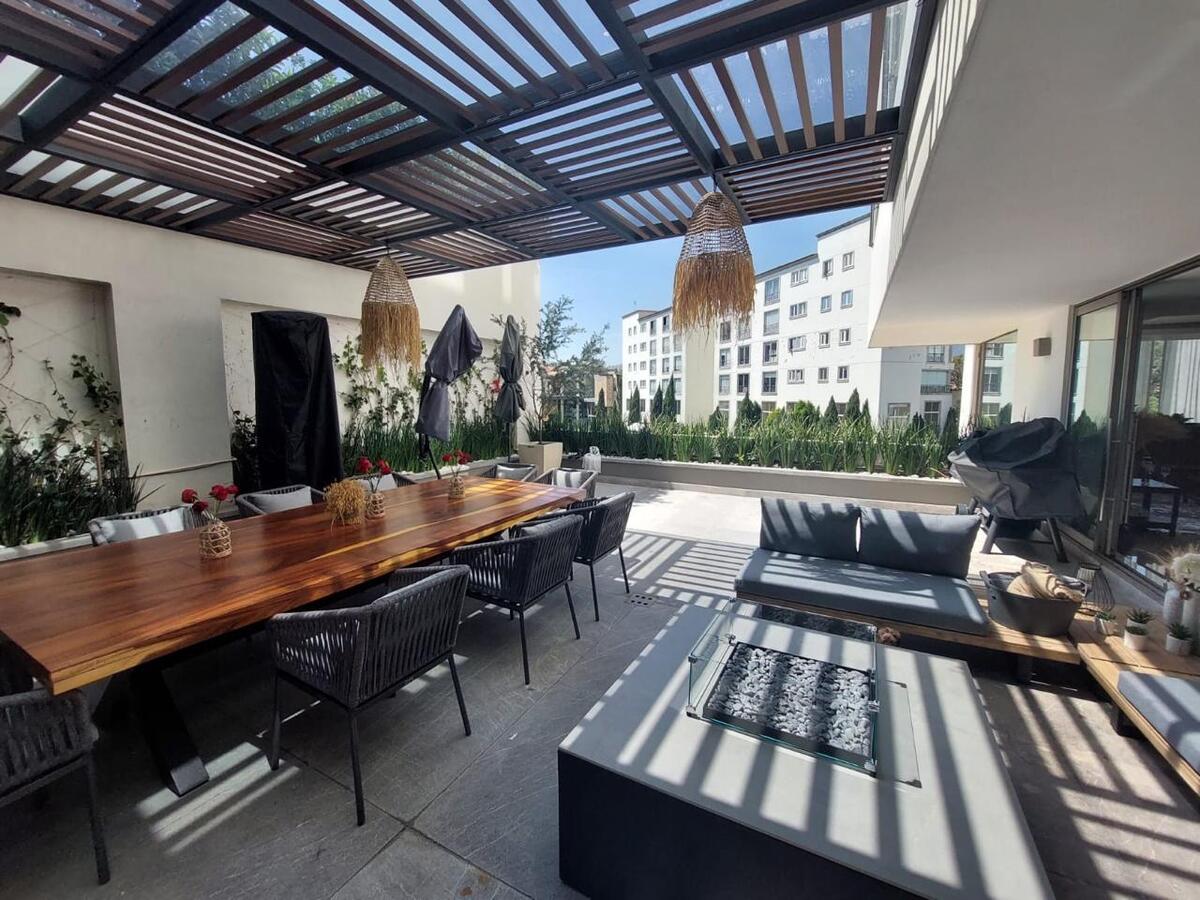 Precioso departamento tipo Garden House Americano, terraza estilo, Carolo, Family Room, sala, comedor, estudio que se puede convertir en cuarta recámara, 4 estacionamientos, 2 Bodegas, una en la parte alta y otra en el sótano.