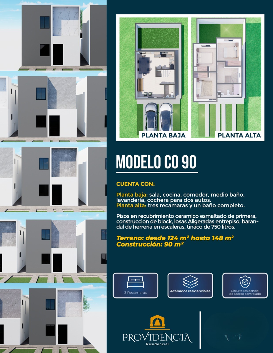 Planta baja: Sala, cocina, comedor, medio baño, lavandería y cochera para 2 autos.