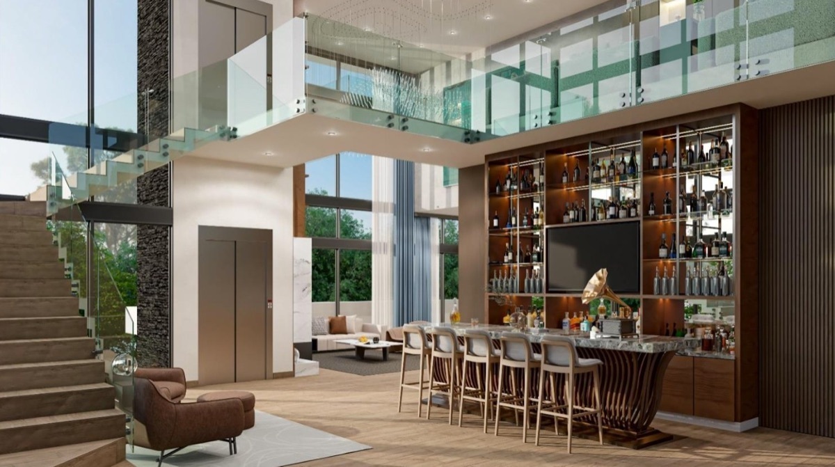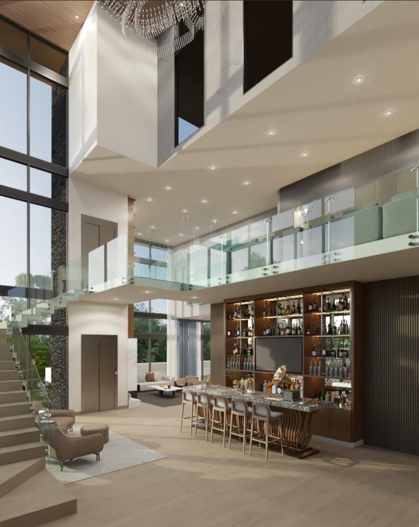 - Covered rooftop with preparation for hot tub, social area, bathroom, bar with sink.