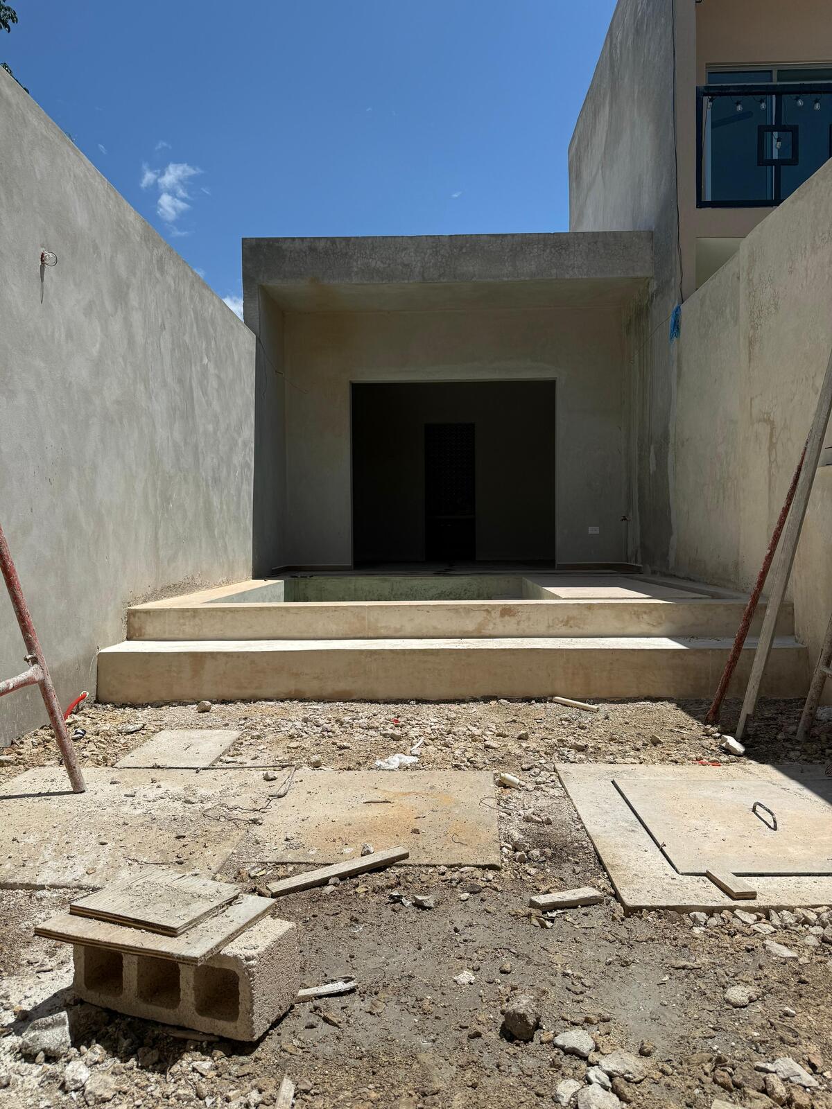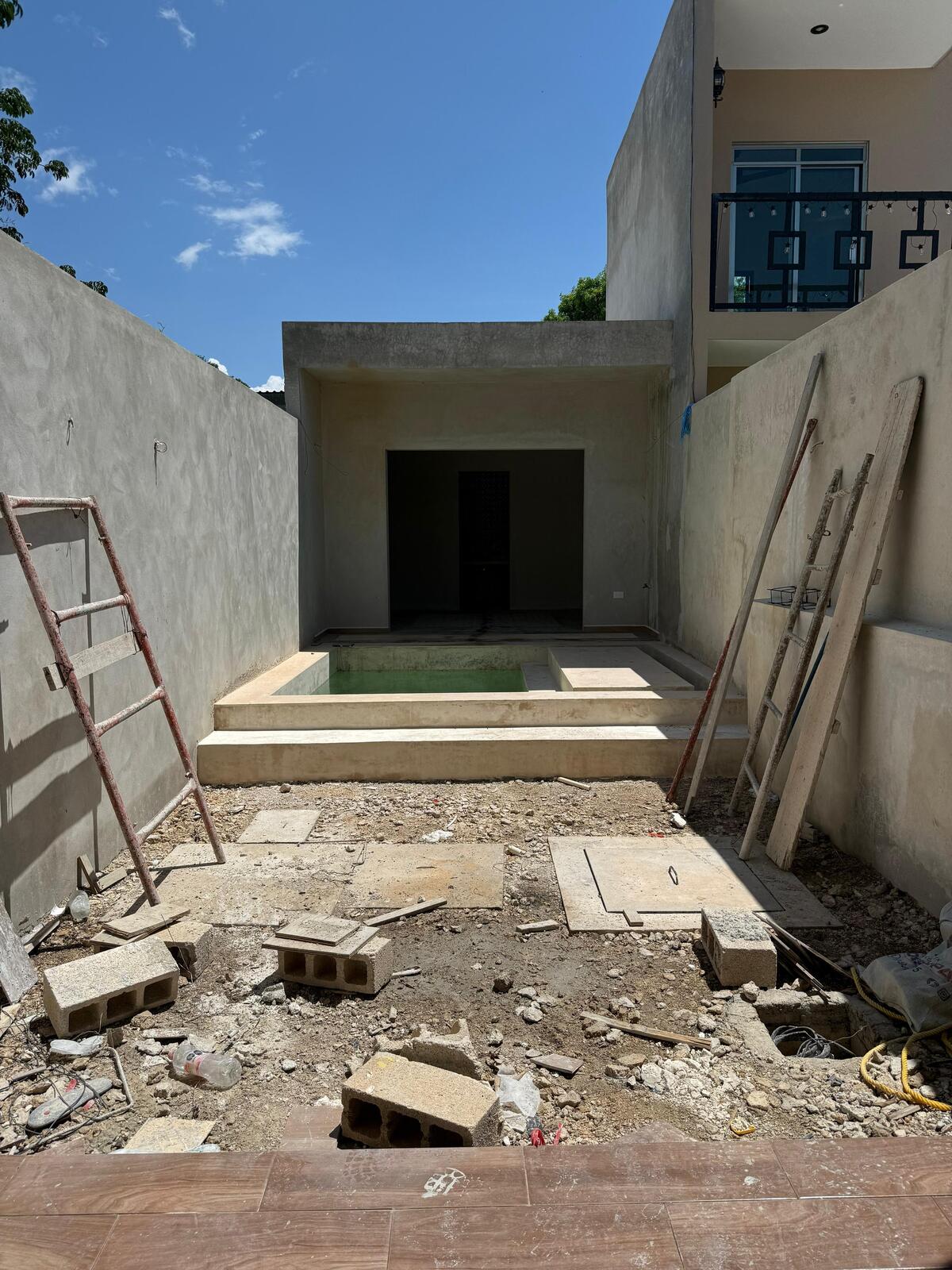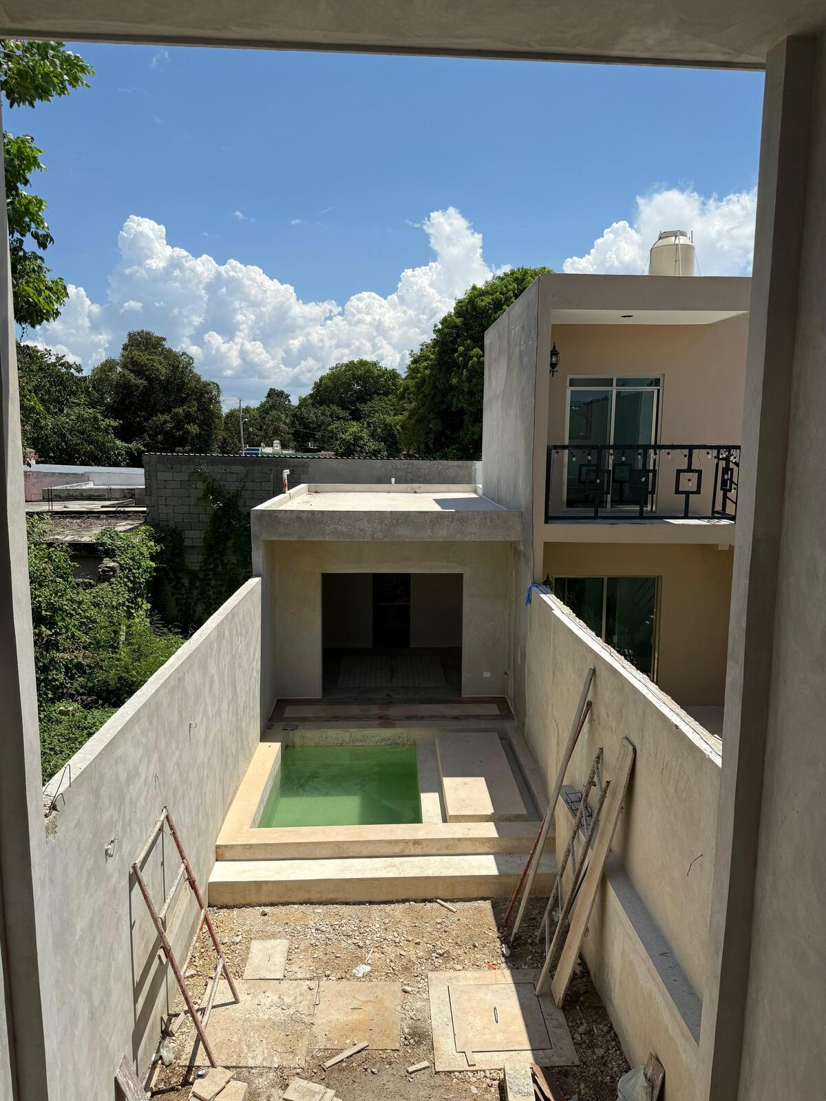 I'm pre-selling this house, currently being renovated, located in the quiet San Cristóbal neighborhood of Mérida's Downtown. The house has three bedrooms (two upstairs and one downstairs), each with its own bathroom, and an extra guest bathroom (total 3.5 bathrooms). The layout includes a living room, an entrance hall with a guest bathroom, a kitchen, a double-height covered terrace, a patio with a small pool, and a bedroom with a bathroom at the back. Upstairs, there's a laundry area and two bedrooms with their own bathrooms (one with a small balcony).