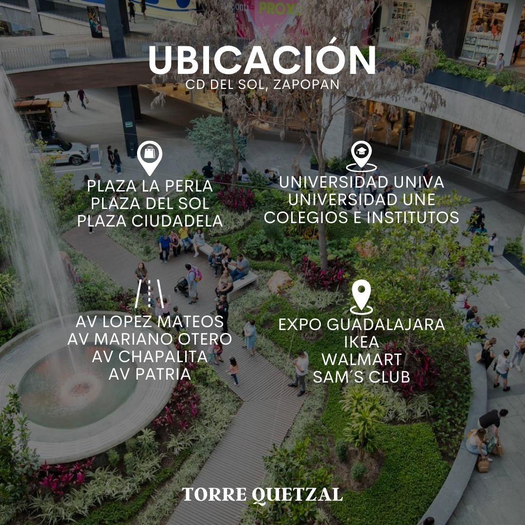 An exceptional location near Plaza del Sol, Plaza La Perla, Plaza Ciudadela, and main avenues such as López Mateos, Mariano Otero, Patria, Tepeyac, Chapalita, etc.