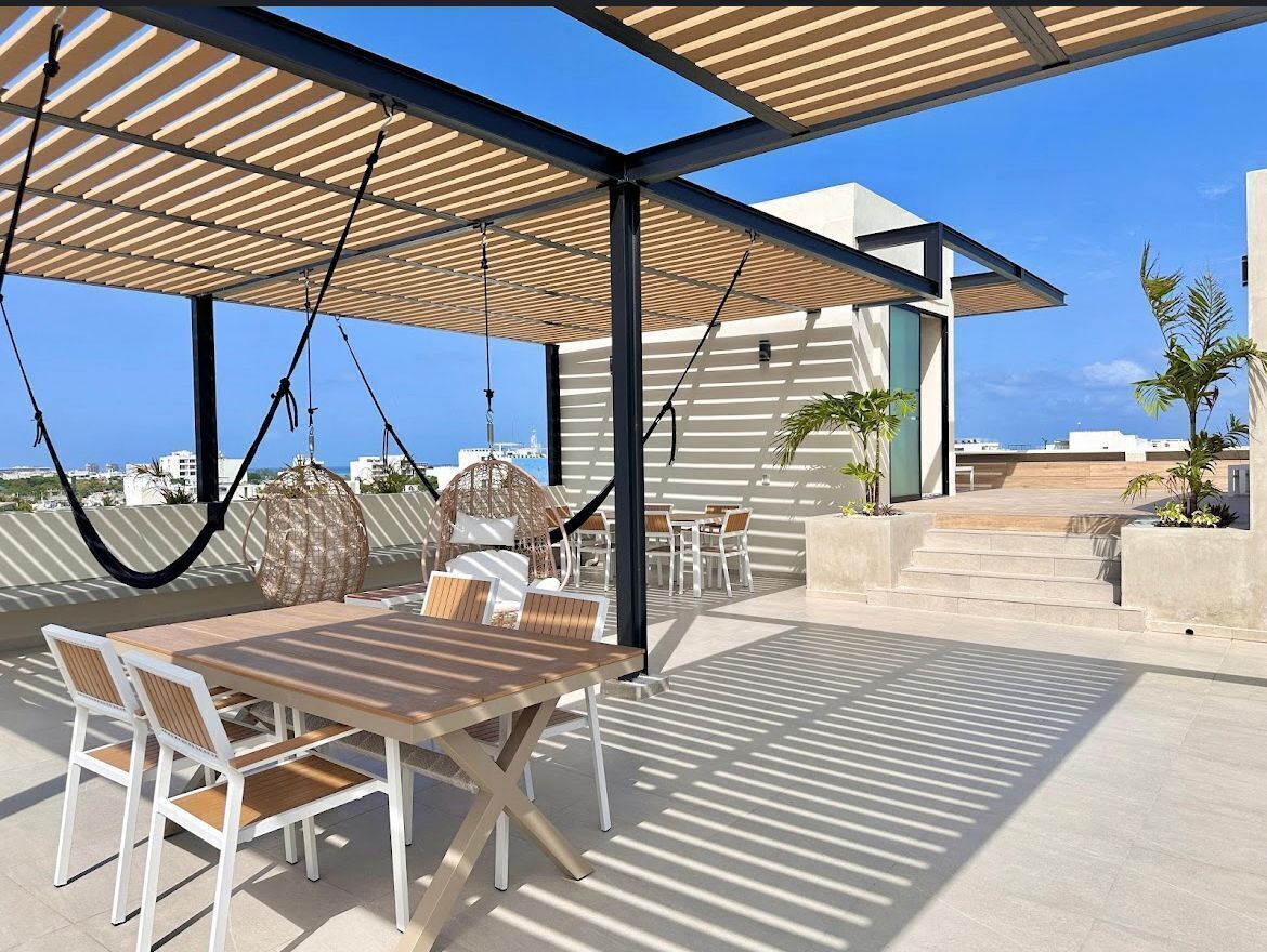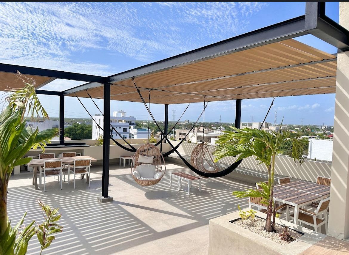 Rooftop con piscina infinita, solárium, áreas de descanso con hamacas y asador.