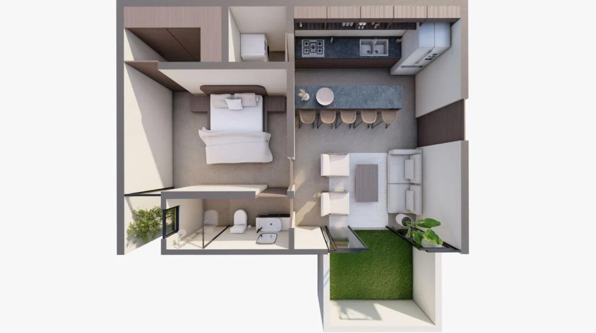 La cocina integral equipada, luminosa y con los mejores acabados y equipo se integra perfectamente al área social, ofreciendo un ambiente moderno y rodeado de vegetación.