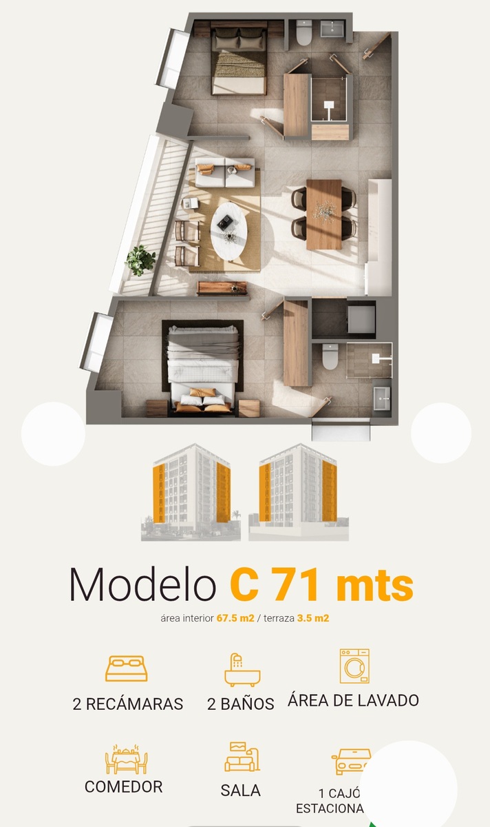 57 departamentos distribuidos de forma inteligente, con espacios atractivos, funcionales y luminosos.