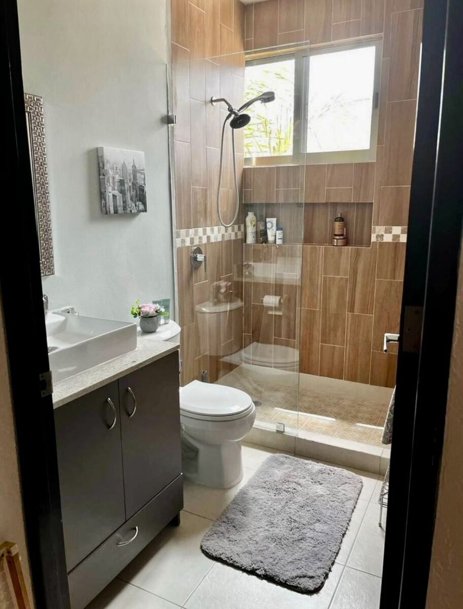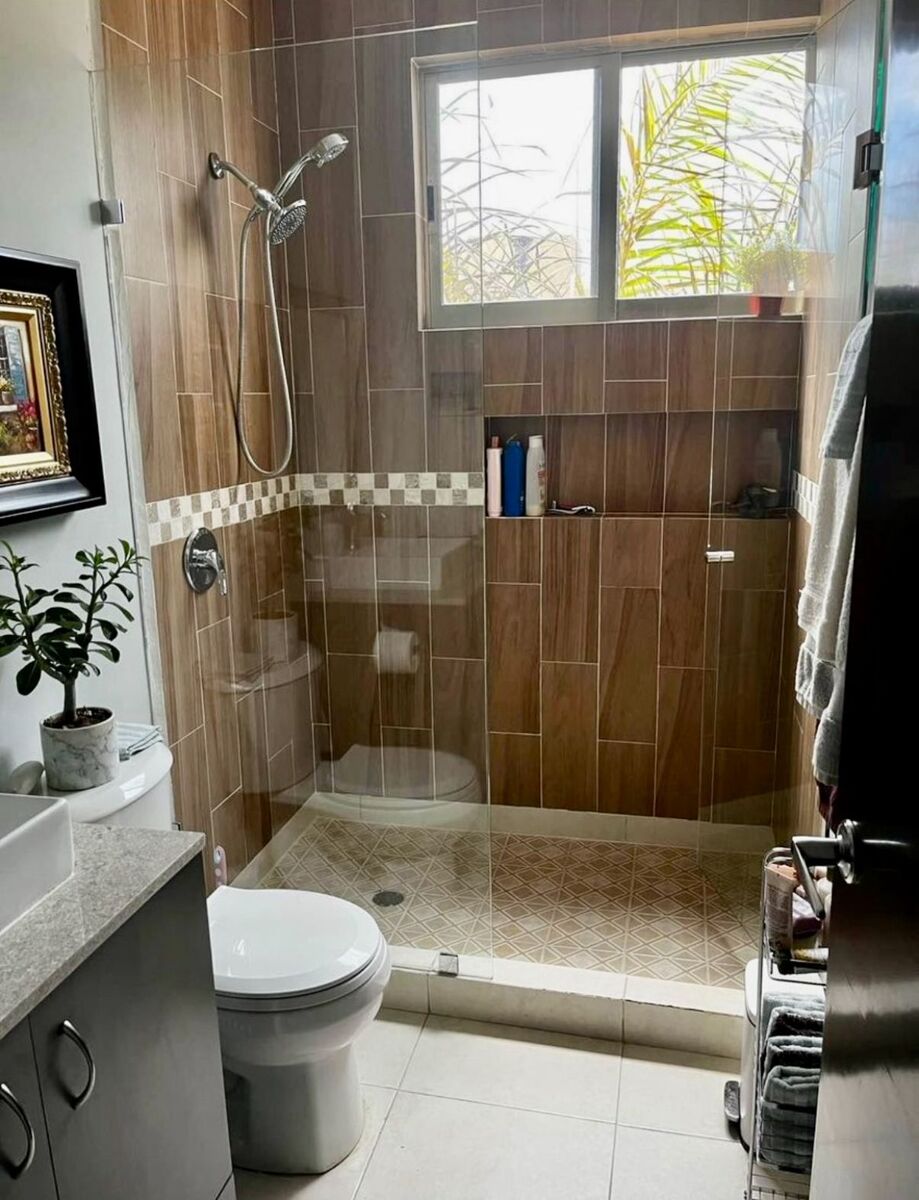-Baños remodelados con canceles de vidrio, azulejos cerámicos, grifería Moen, sanitarios y muebles nuevos