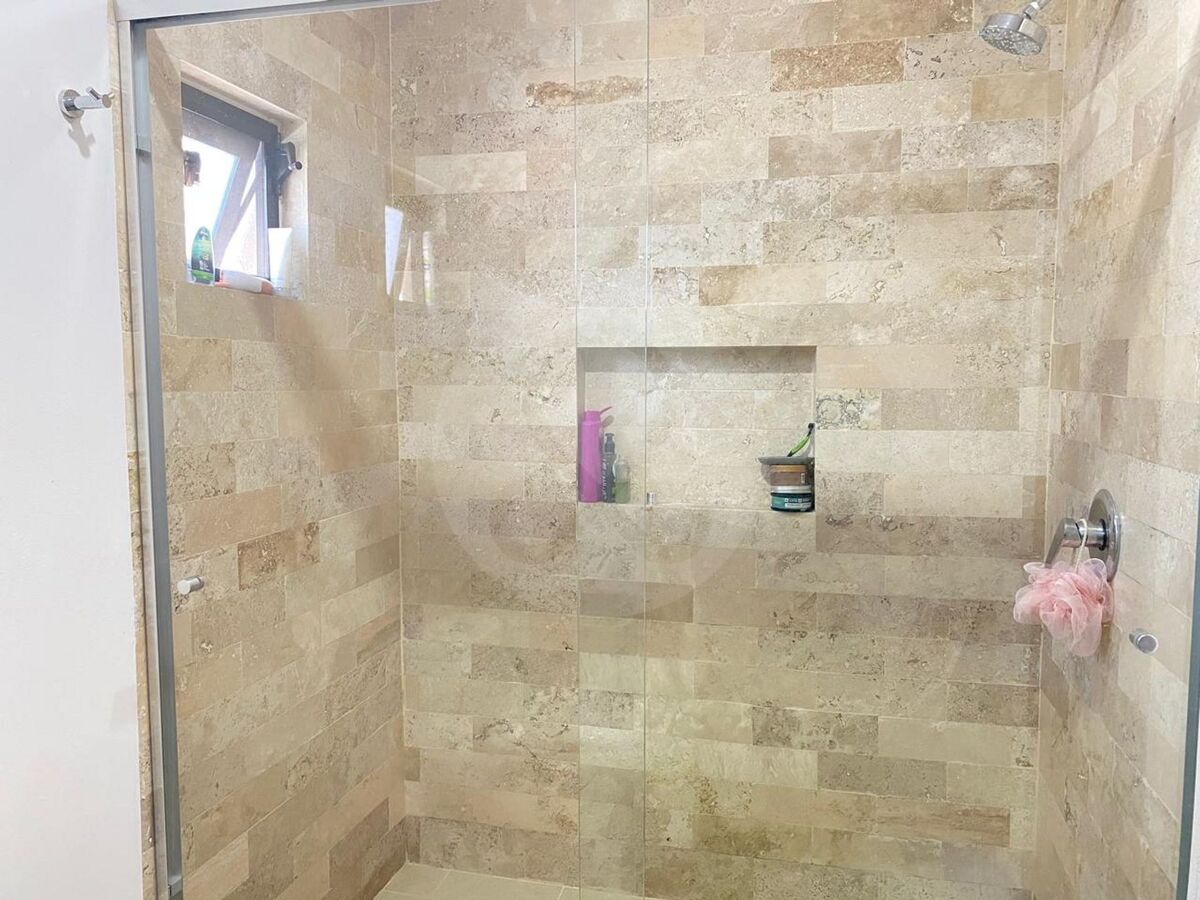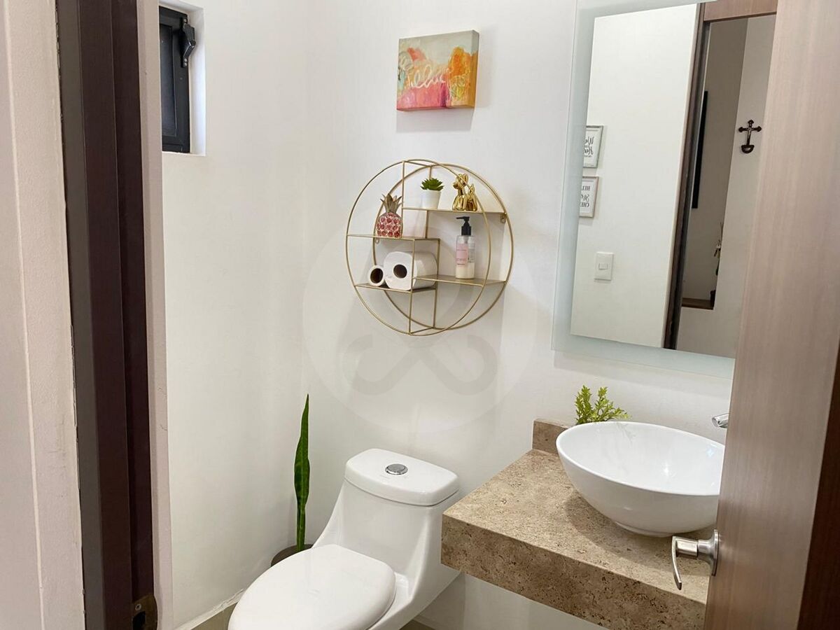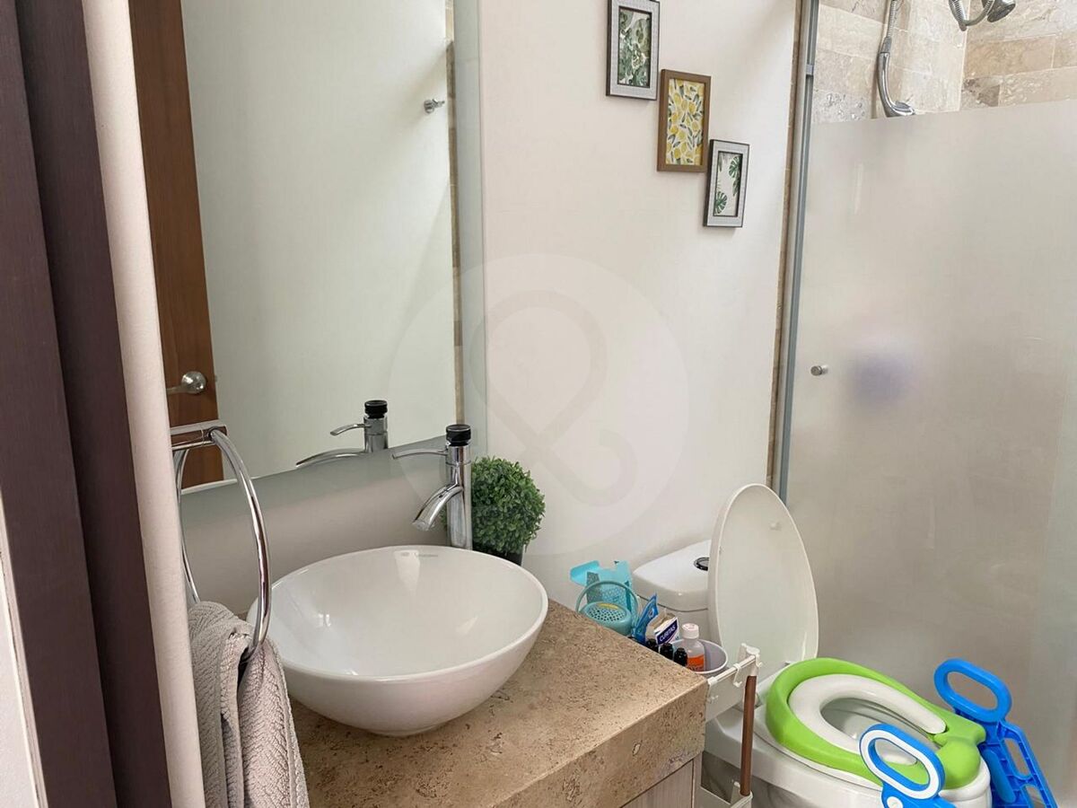 2 baños y medio. Todos los baños tienen espejos y canceles de vidrio templado, los 2 baños completos con mueble de baño para almacenar cosas.