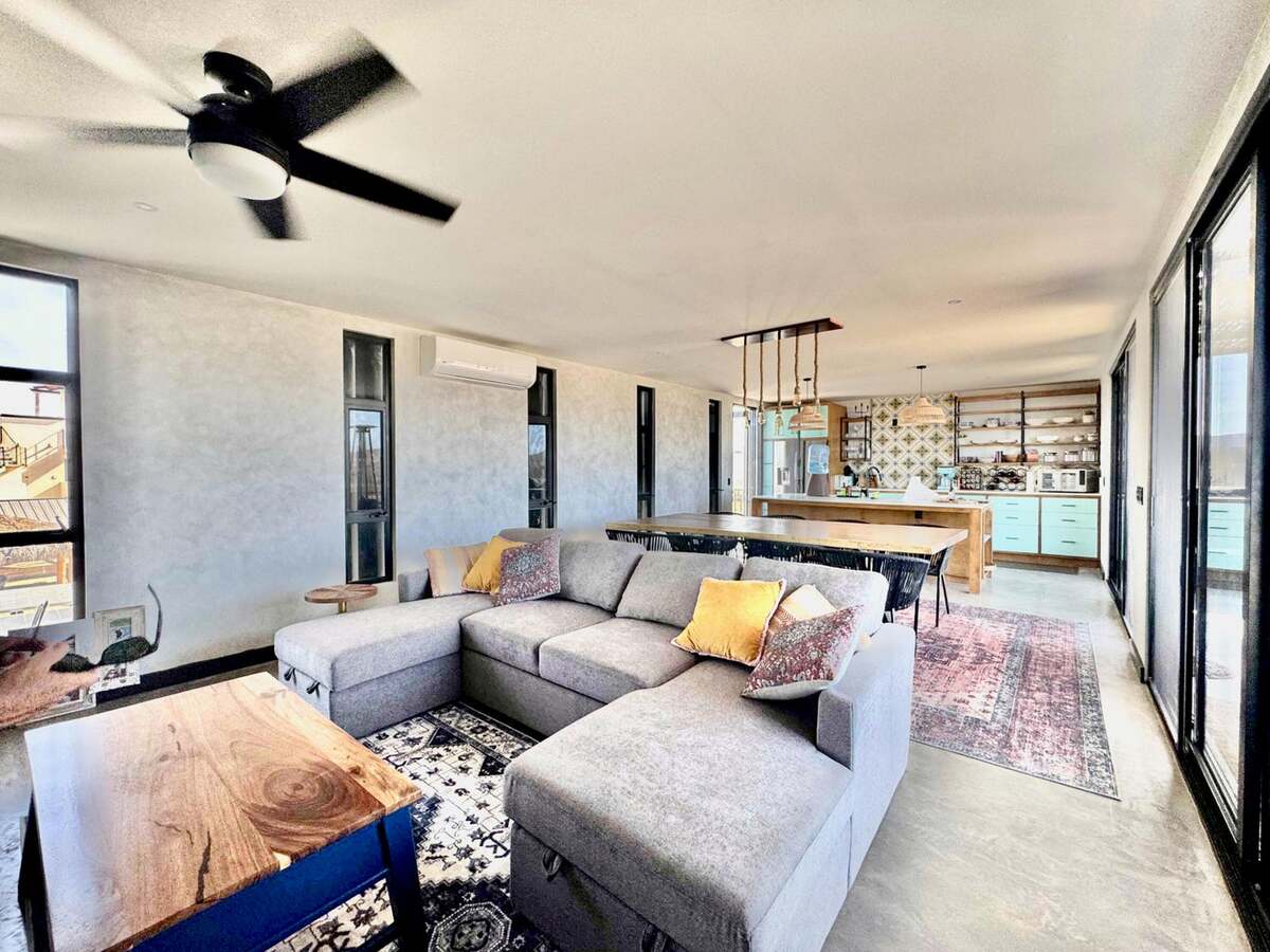 La amplia sala de estar se abre hacia la terraza y el rooftop, donde podrás admirar espectaculares amaneceres y atardeceres.