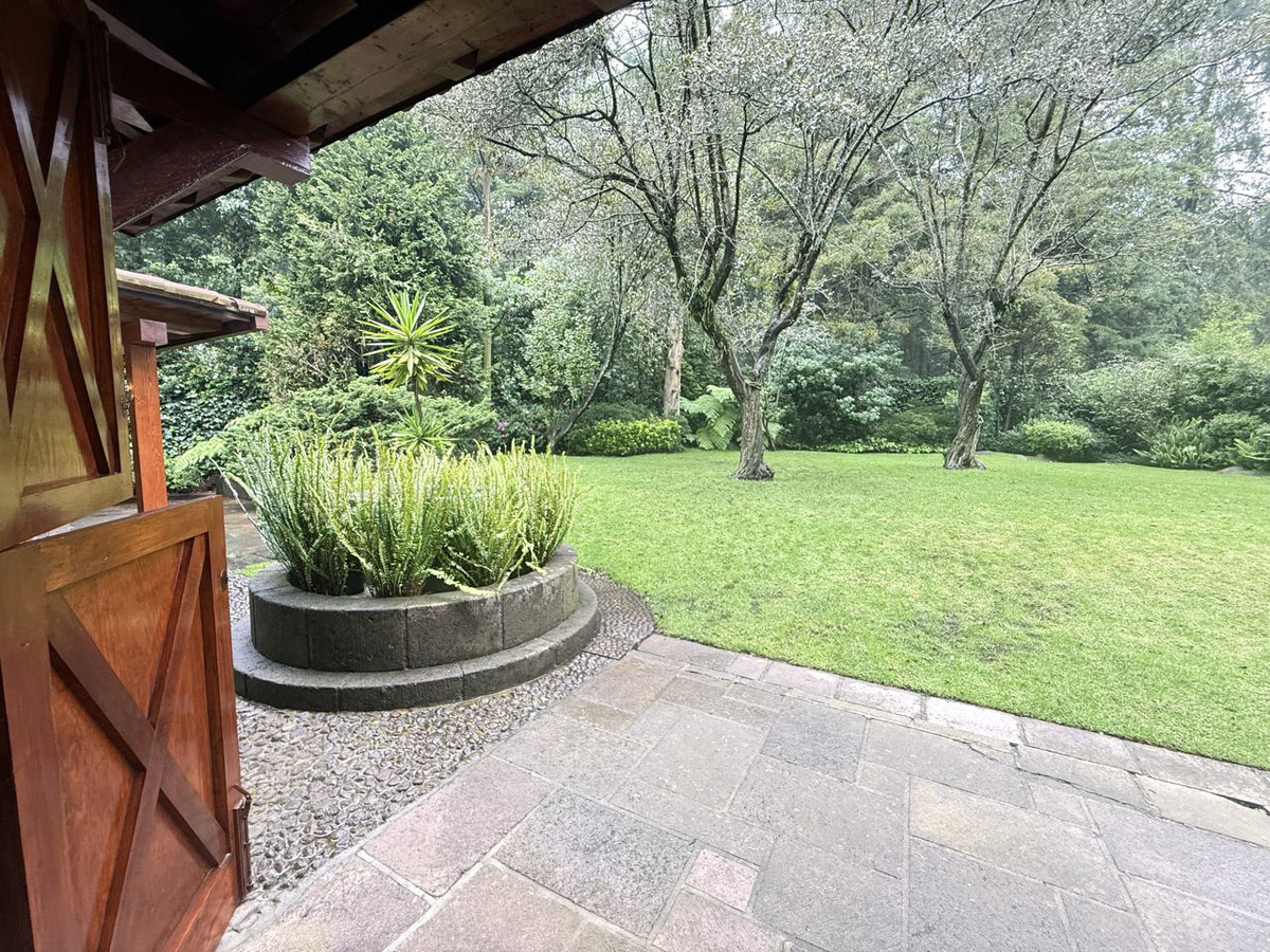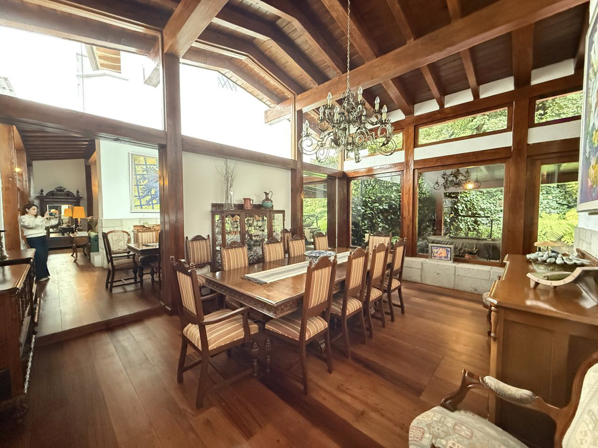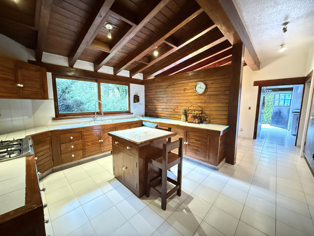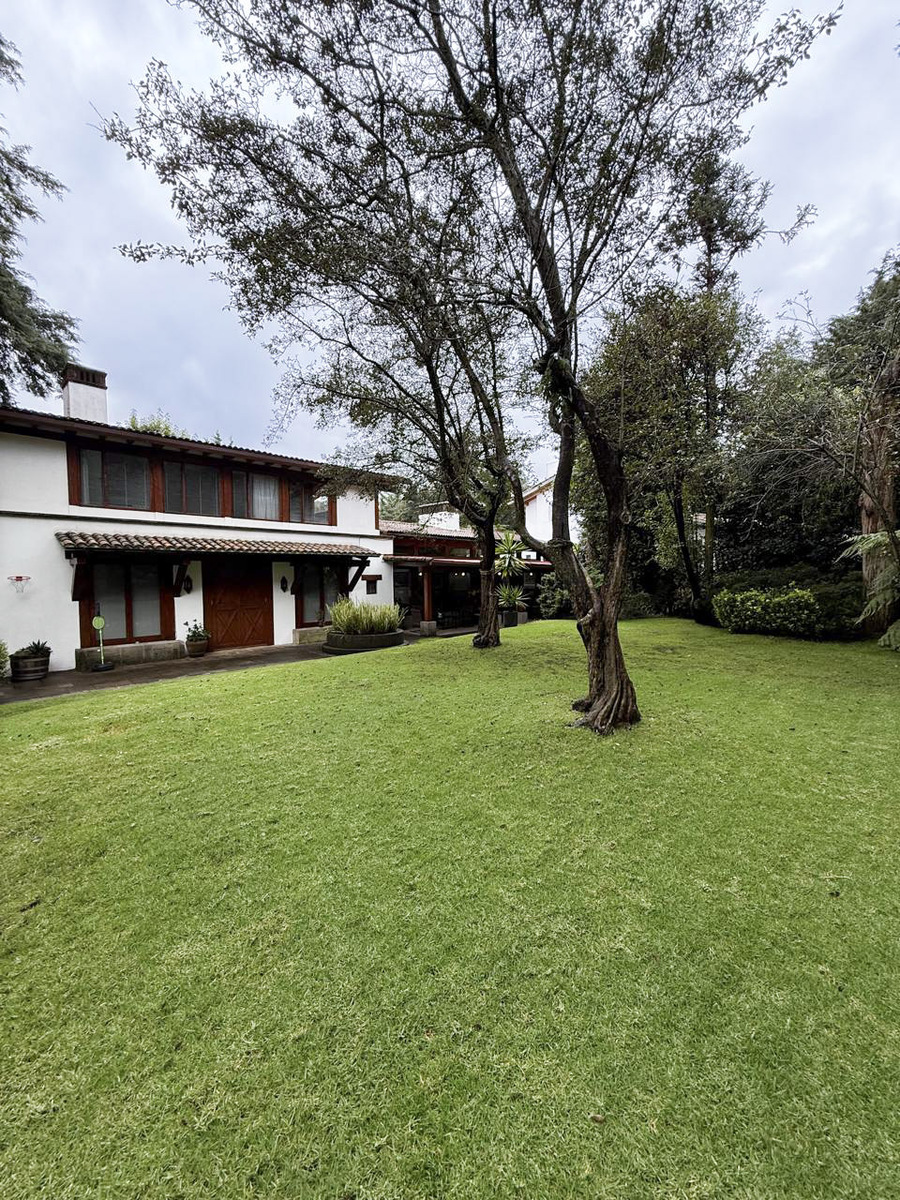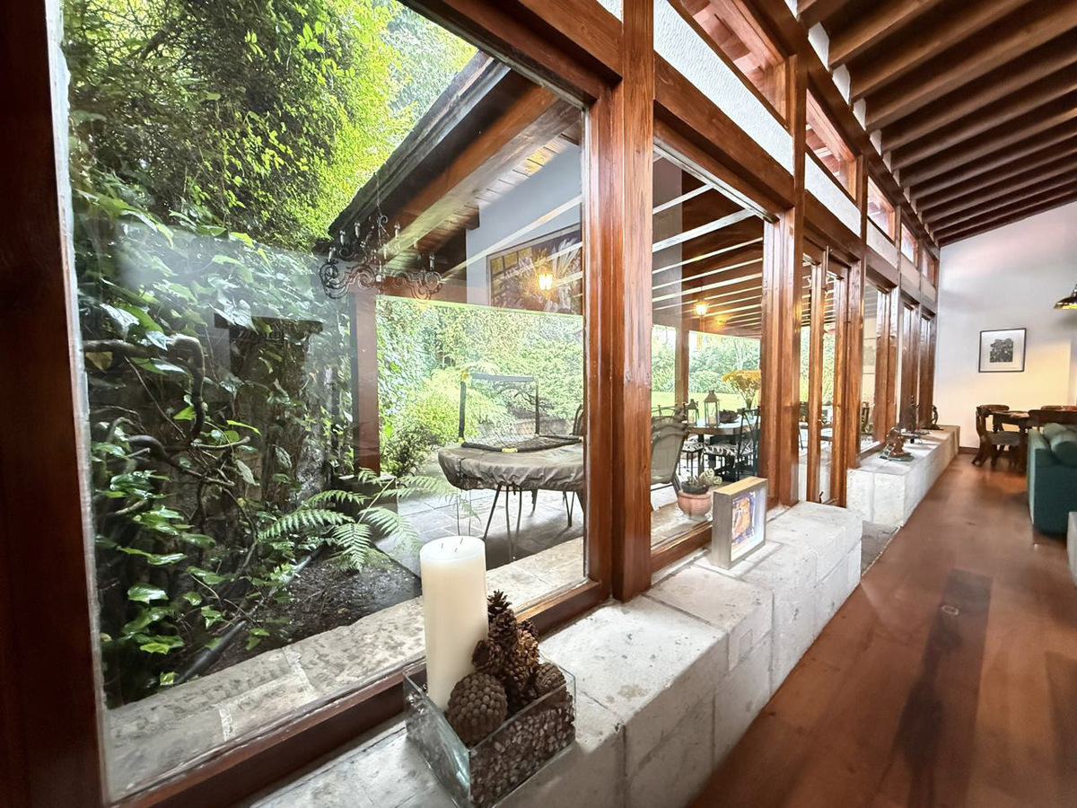 En la planta baja también se encuentra un amplio family room, una sala comedor de dobles alturas con chimenea, techo y vigas de madera , acceso a la terraza de aproximadamente 180 m² y un jardín de 200 m², ideal para disfrutar de la tranquilidad del bosque. La cocina es amplia, con área de lavado y un cuarto de servicio que incluye baño, así como un patio de servicio. La cochera tiene capacidad para 4 autos.