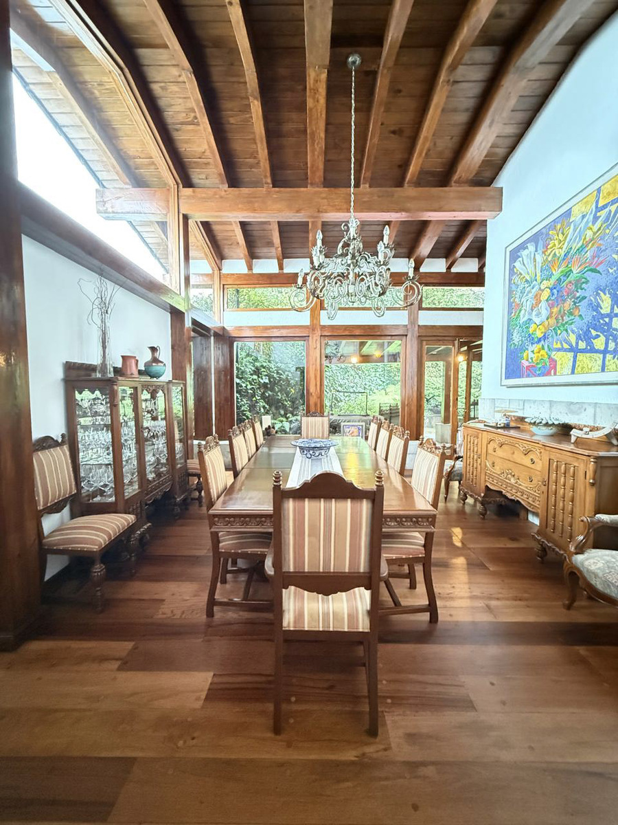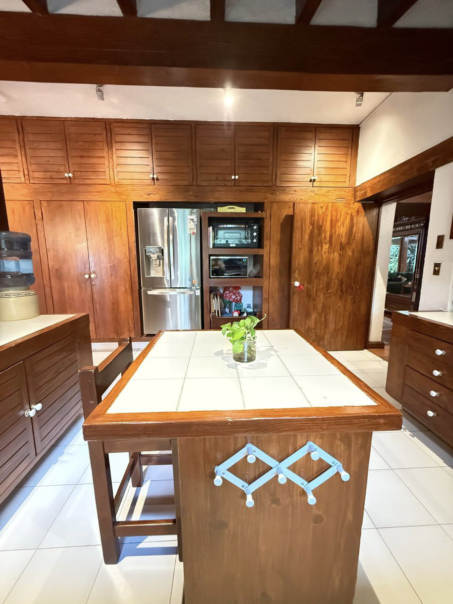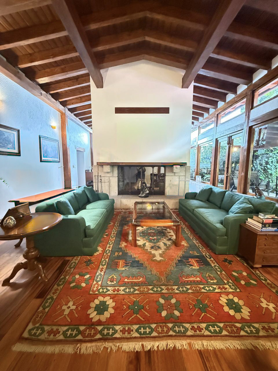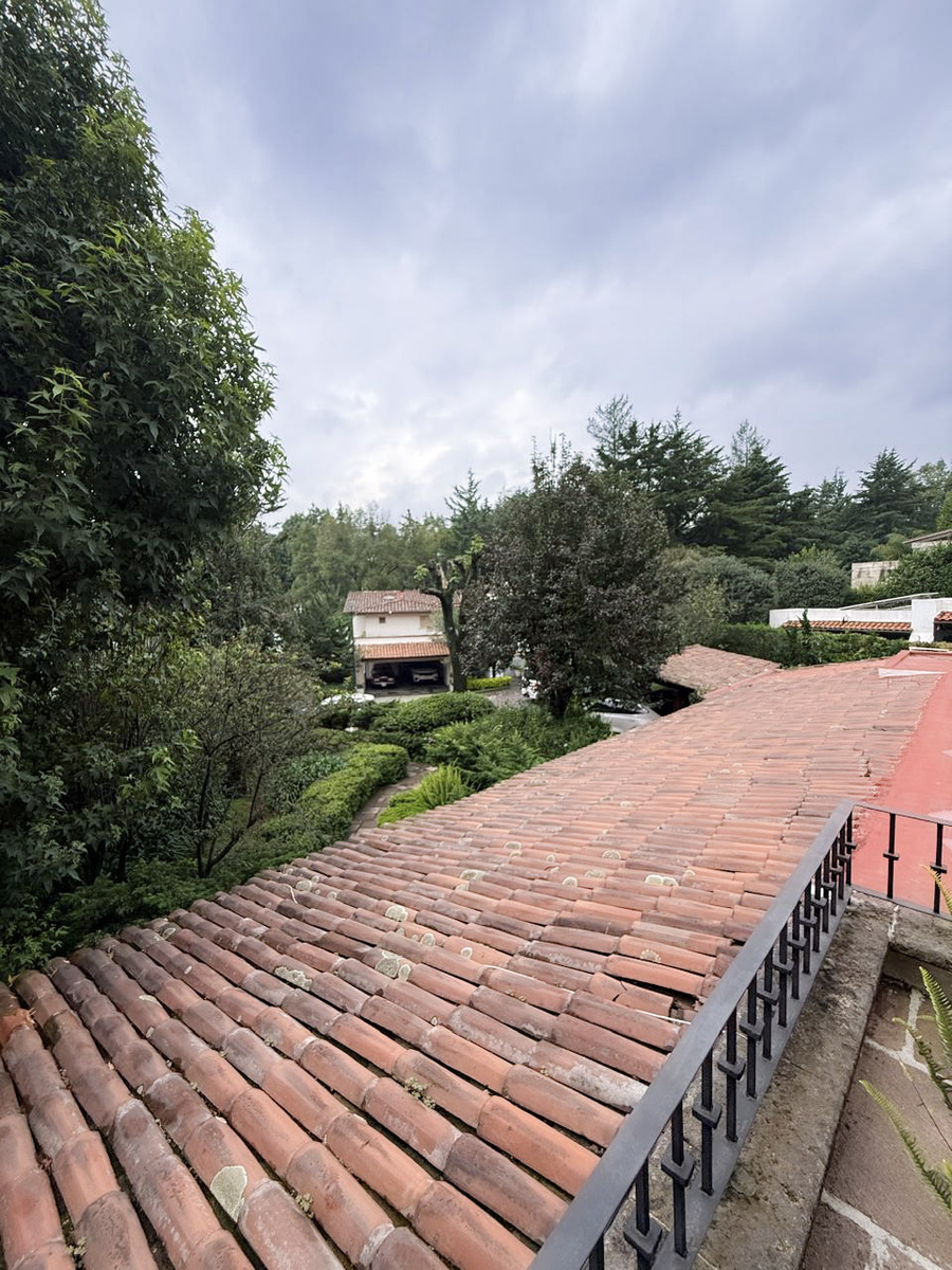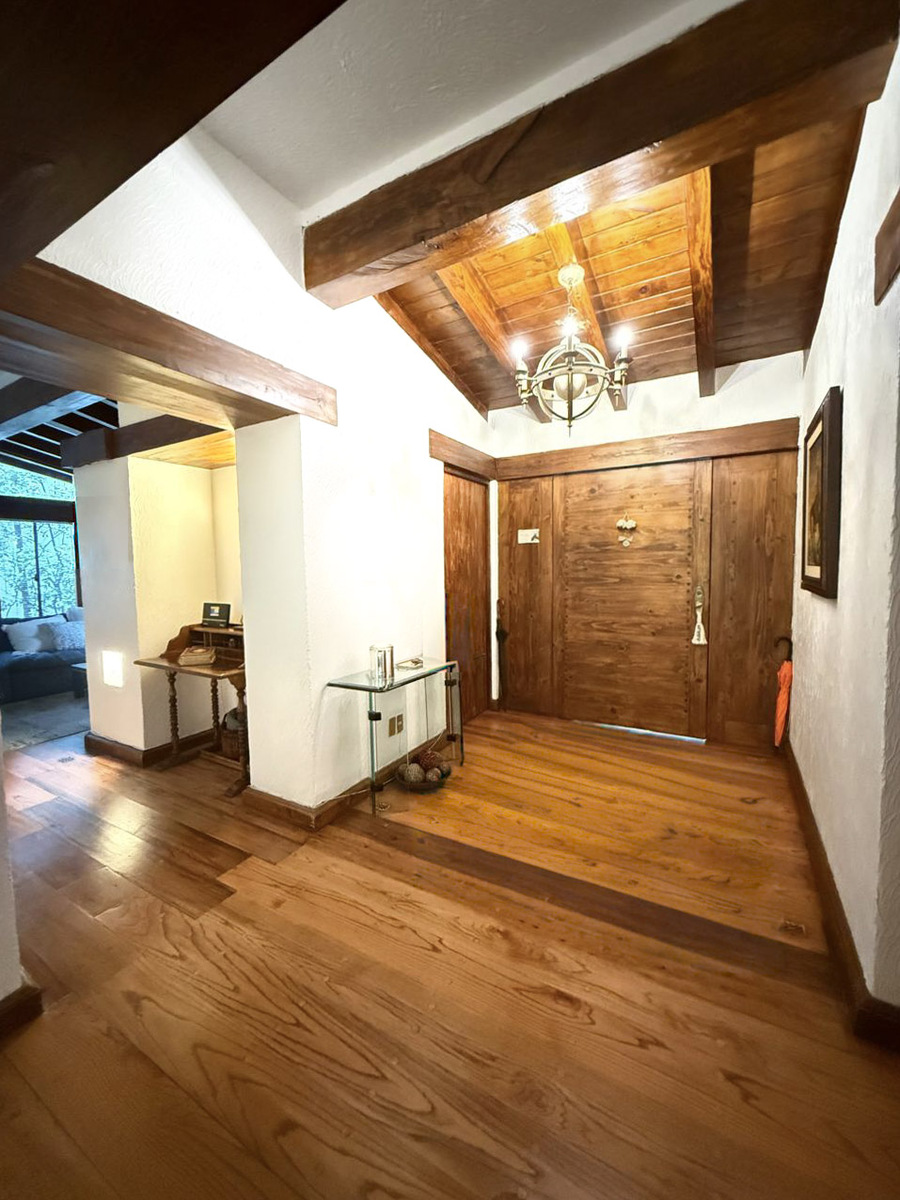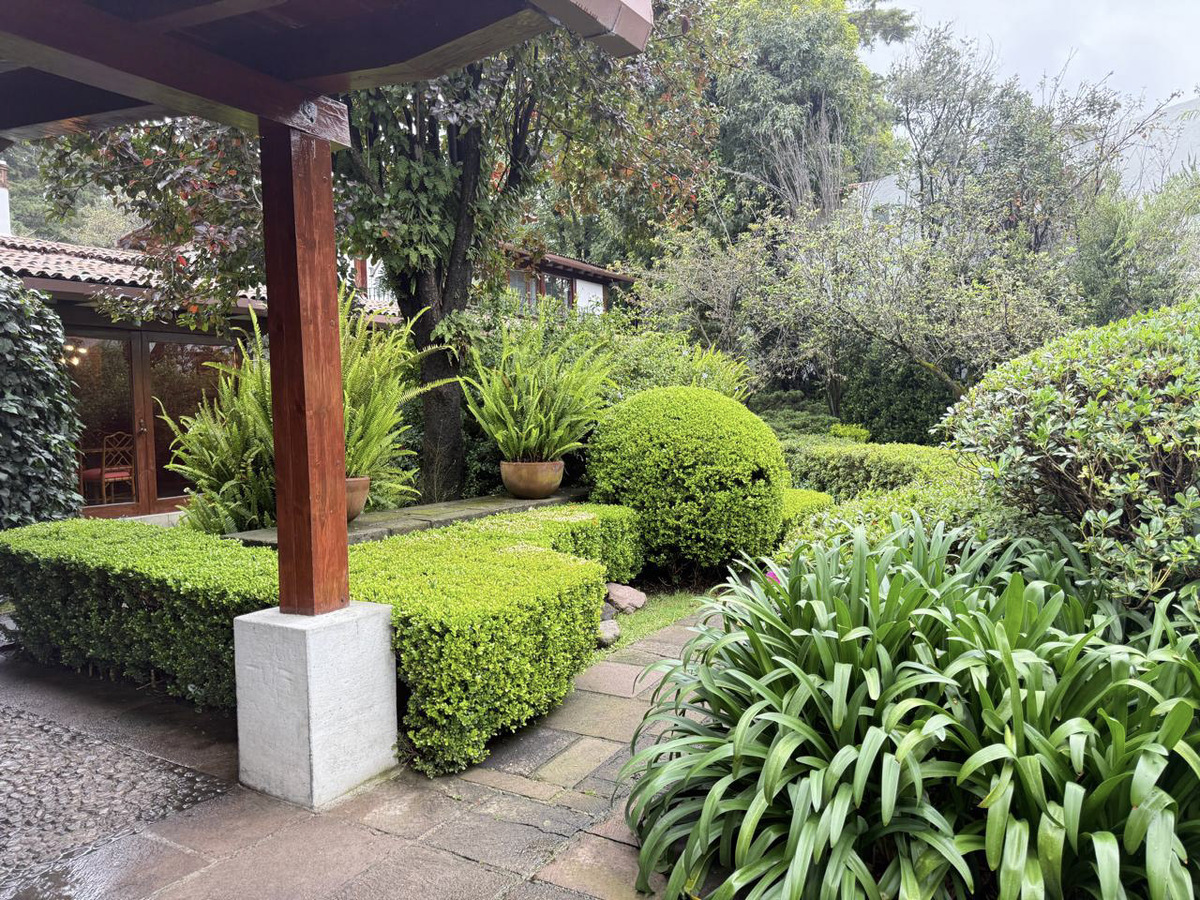 En la planta baja también se encuentra un amplio family room, una sala comedor de dobles alturas con chimenea, techo y vigas de madera , acceso a la terraza de aproximadamente 180 m² y un jardín de 200 m², ideal para disfrutar de la tranquilidad del bosque. La cocina es amplia, con área de lavado y un cuarto de servicio que incluye baño, así como un patio de servicio. La cochera tiene capacidad para 4 autos.