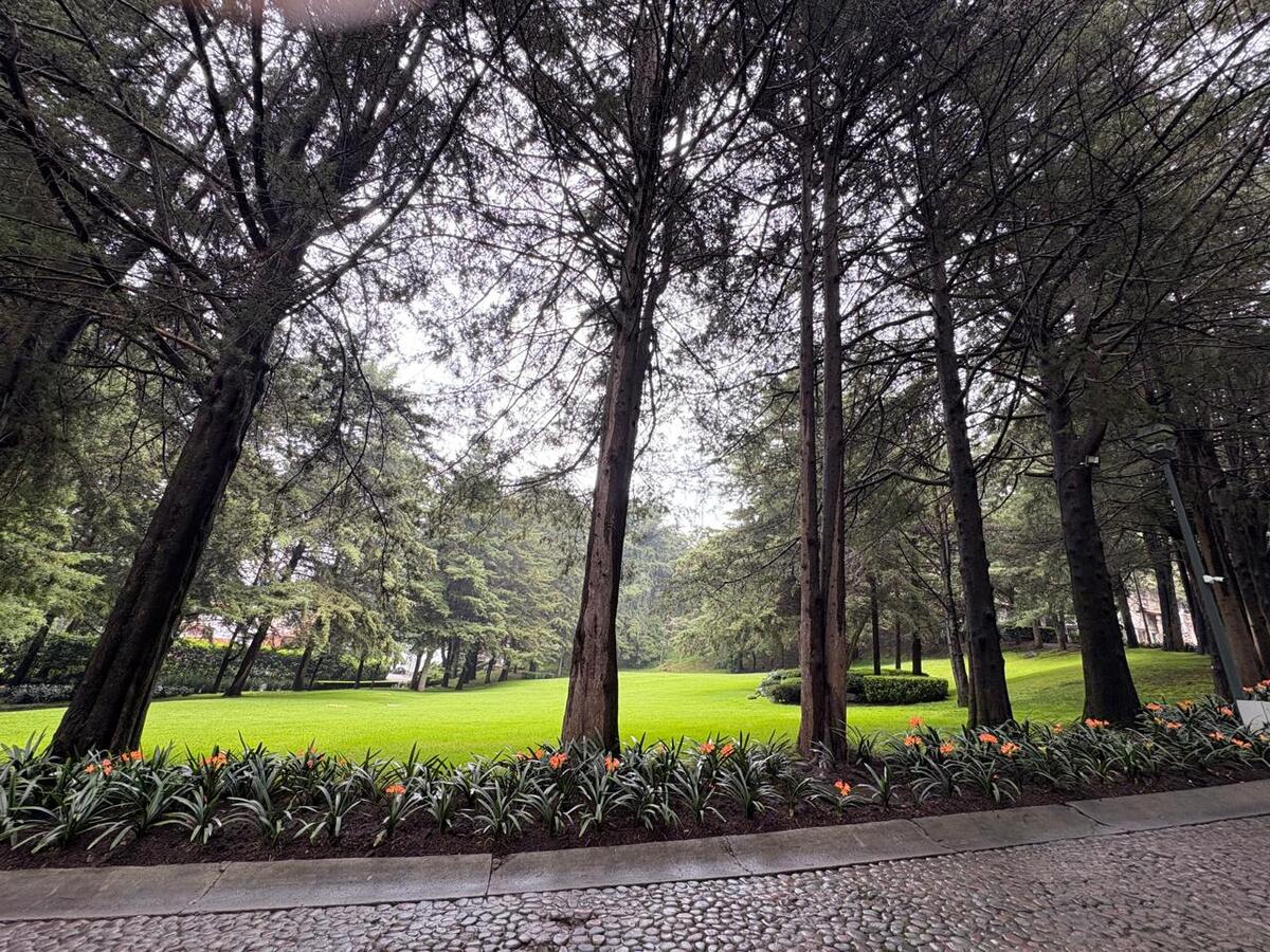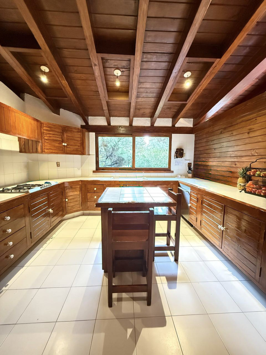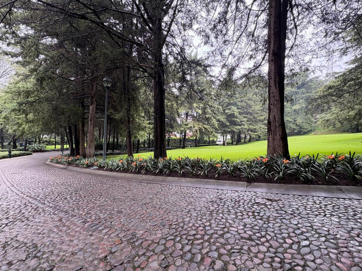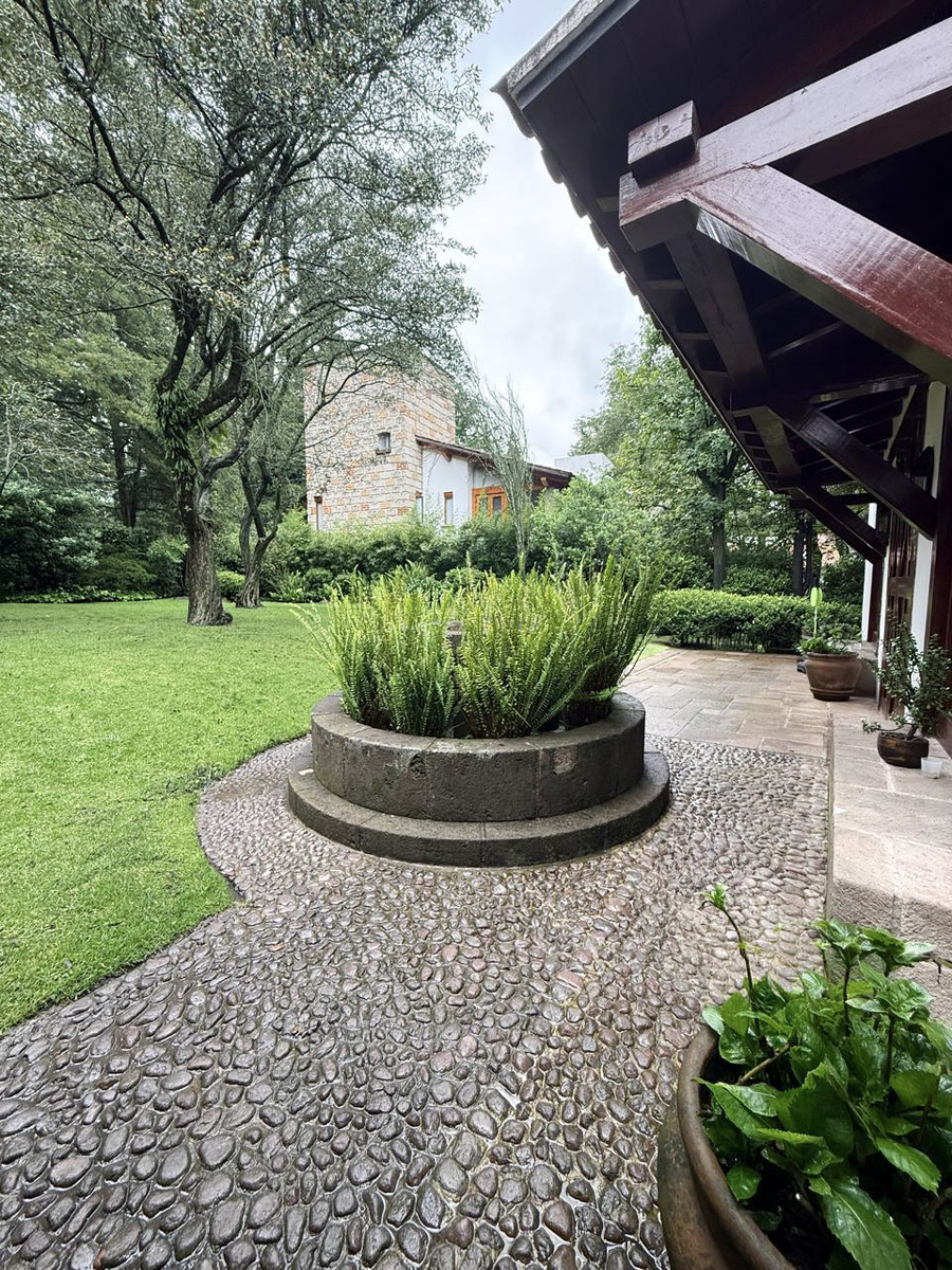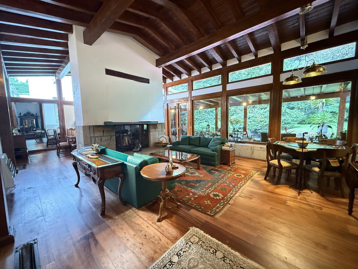 En la planta baja también se encuentra un amplio family room, una sala comedor de dobles alturas con chimenea, techo y vigas de madera , acceso a la terraza de aproximadamente 180 m² y un jardín de 200 m², ideal para disfrutar de la tranquilidad del bosque. La cocina es amplia, con área de lavado y un cuarto de servicio que incluye baño, así como un patio de servicio. La cochera tiene capacidad para 4 autos.