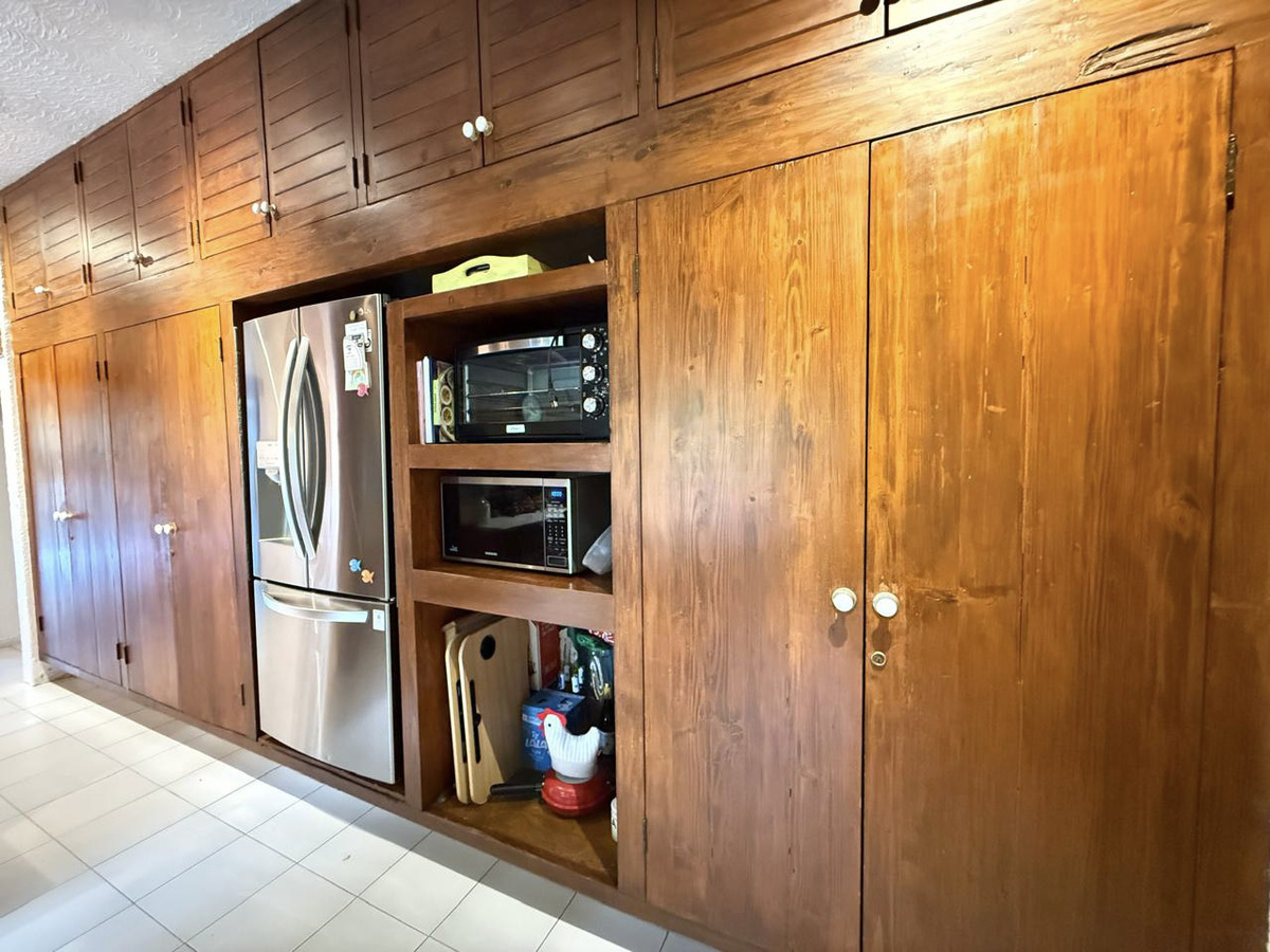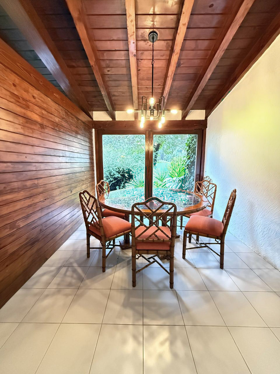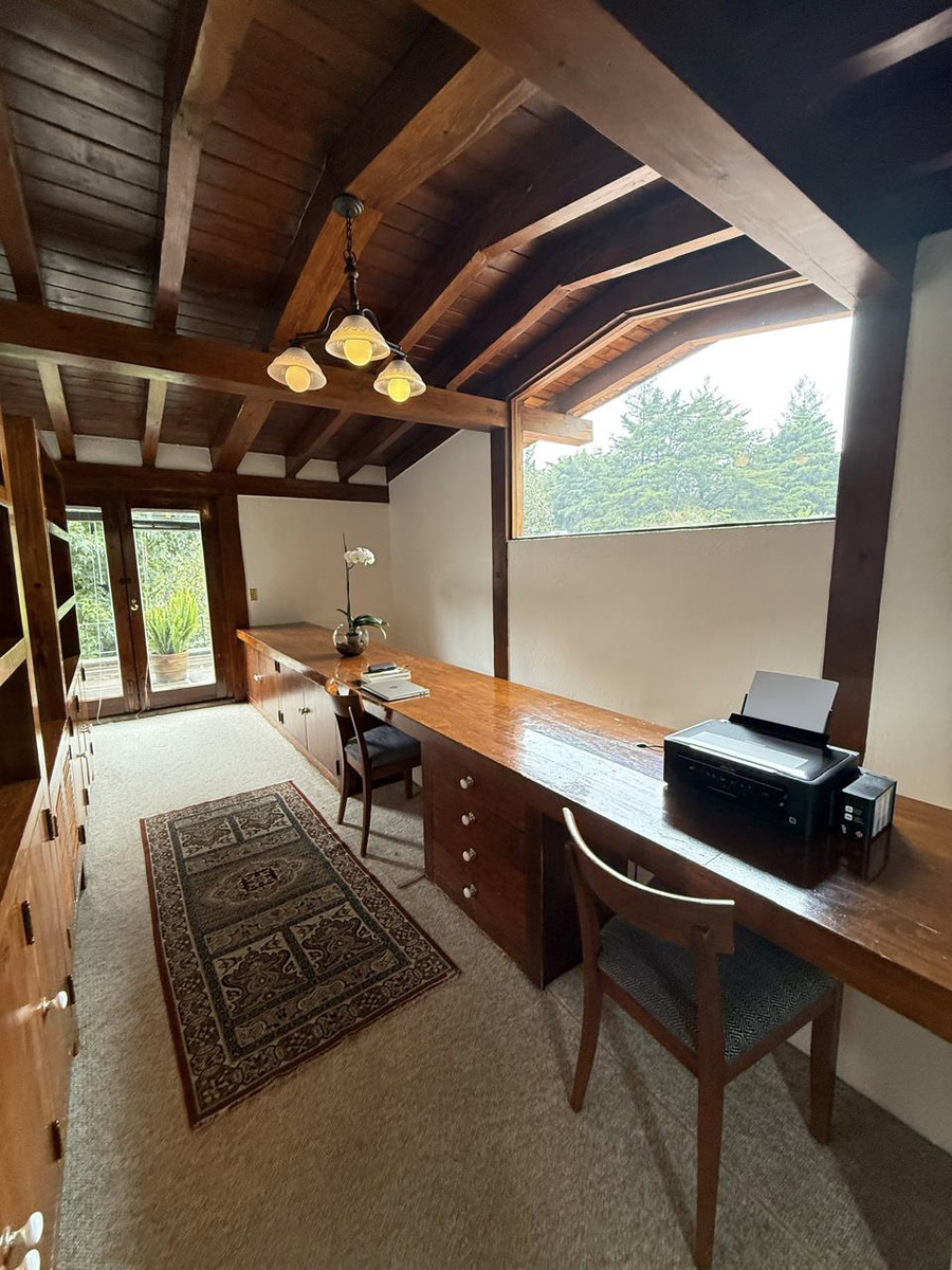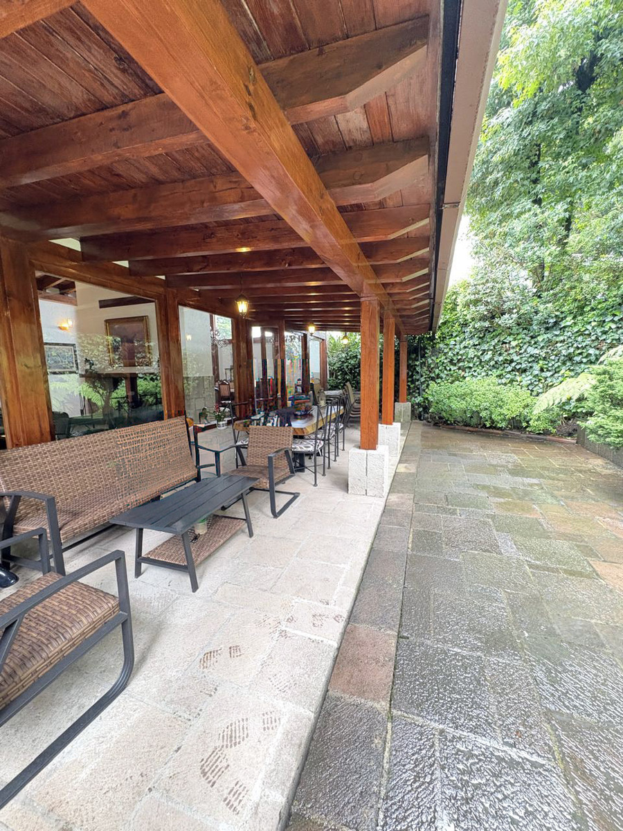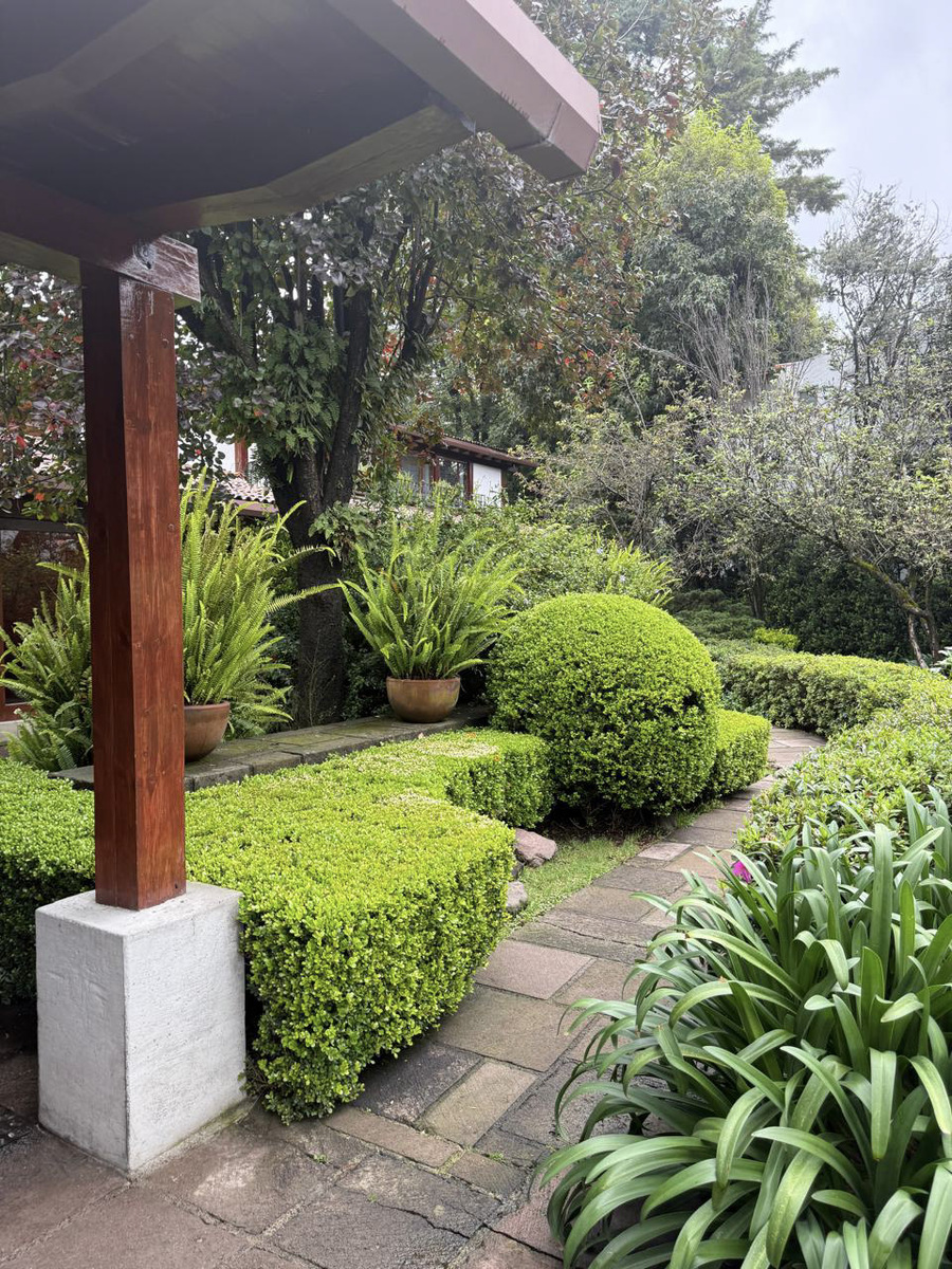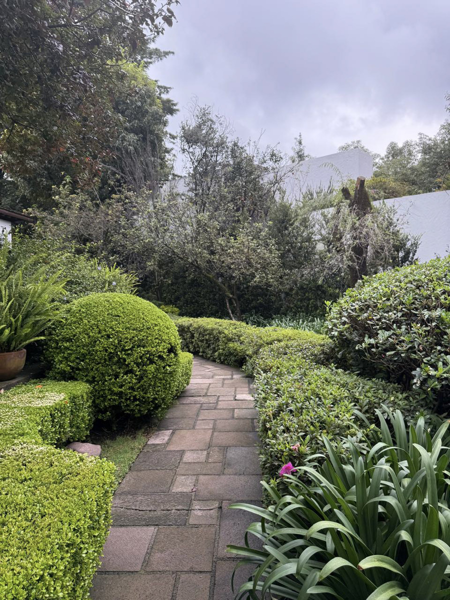 En la planta baja también se encuentra un amplio family room, una sala comedor de dobles alturas con chimenea, techo y vigas de madera , acceso a la terraza de aproximadamente 180 m² y un jardín de 200 m², ideal para disfrutar de la tranquilidad del bosque. La cocina es amplia, con área de lavado y un cuarto de servicio que incluye baño, así como un patio de servicio. La cochera tiene capacidad para 4 autos.