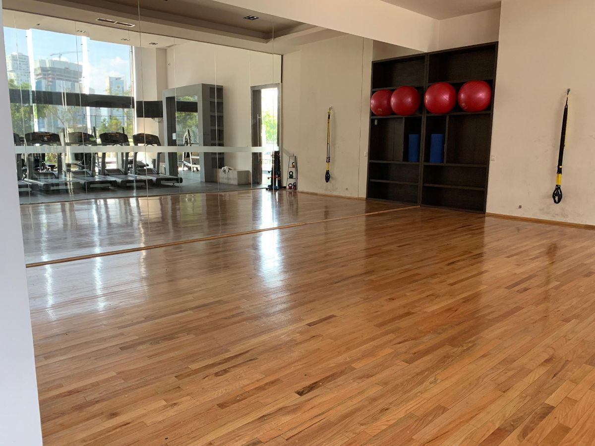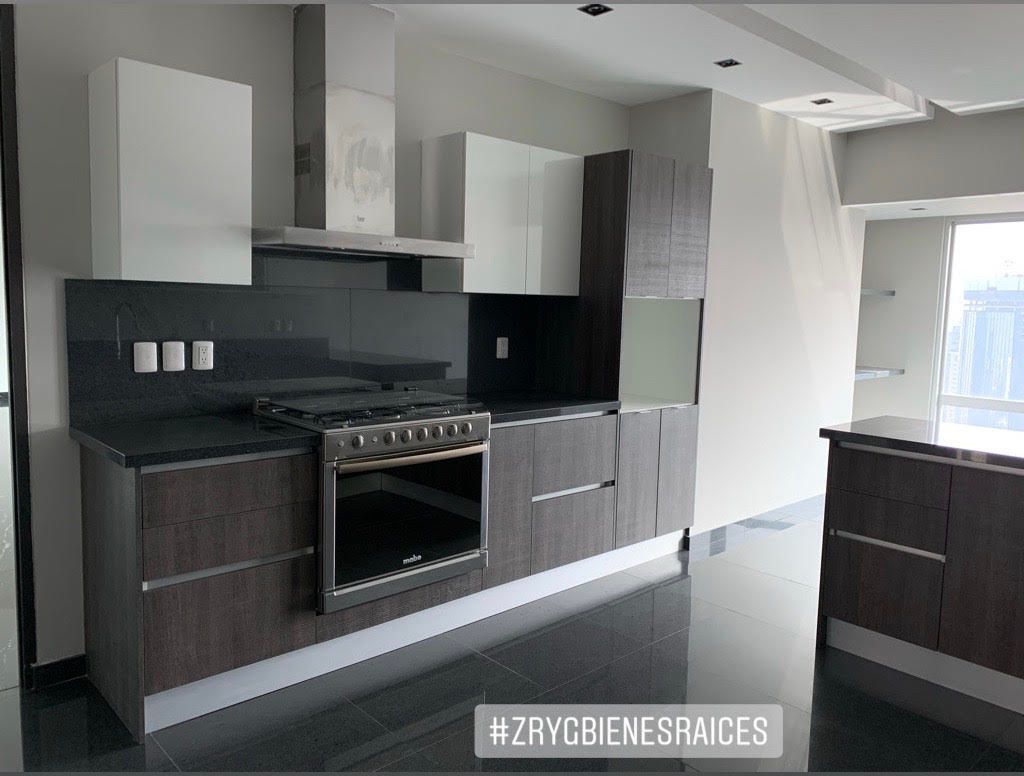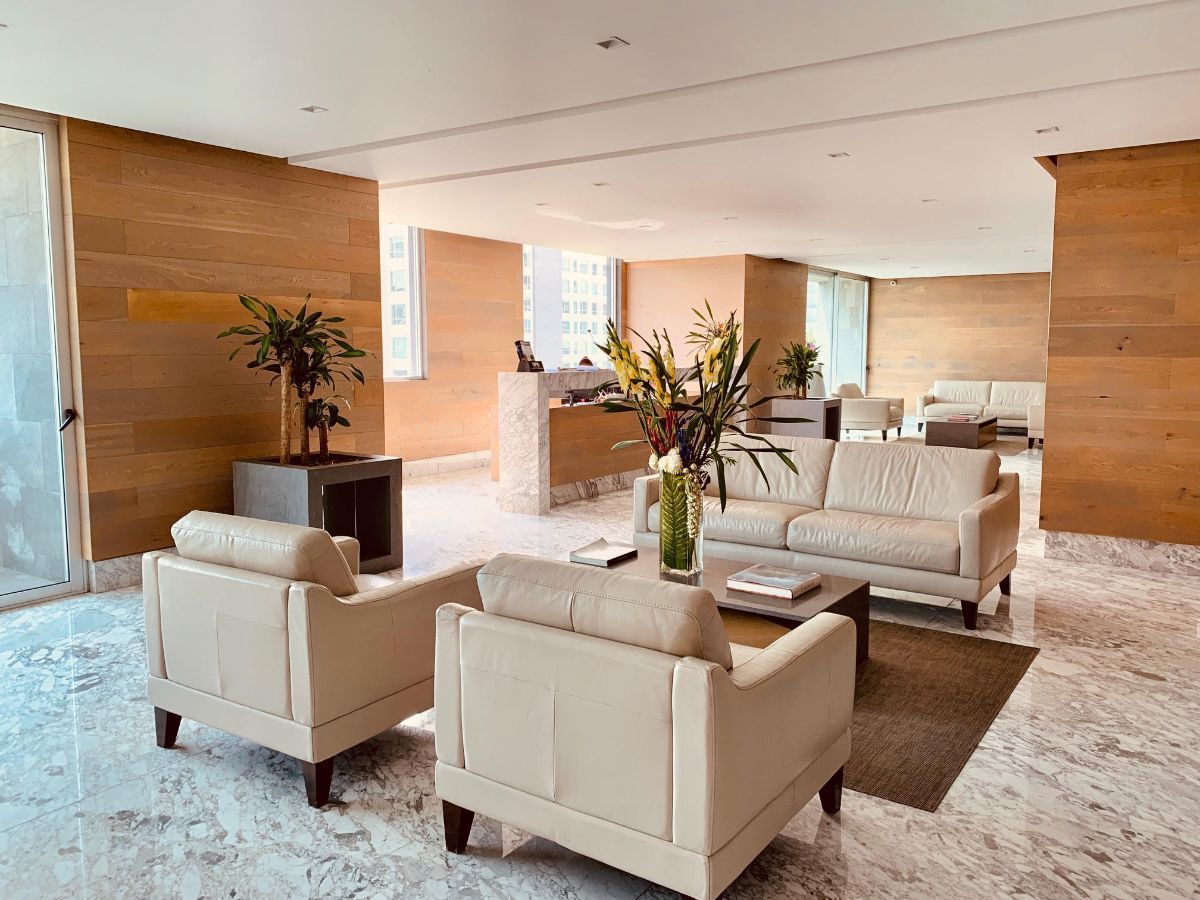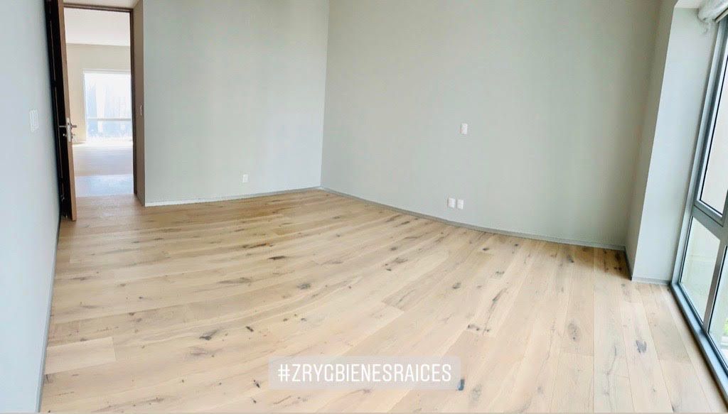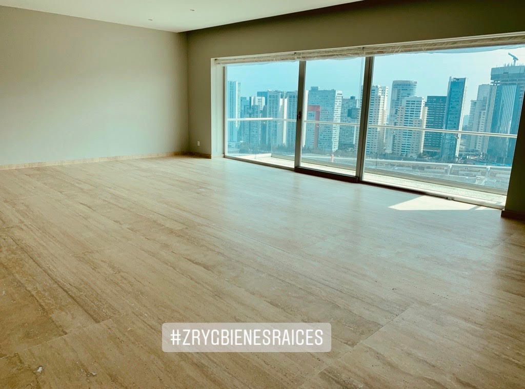 El departamento de 285m2 se distribuye en área de sala, comedor, cocina con barra y antecomedor, tres recamaras con vestidor y baño, cuarto de servicio integrado y área de lavado. Incluye tres cajones de estacionamiento y una bodega.