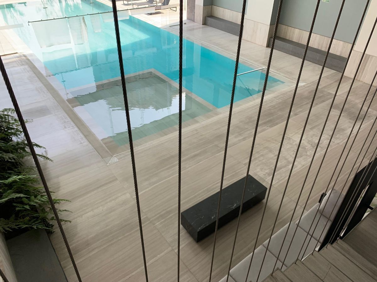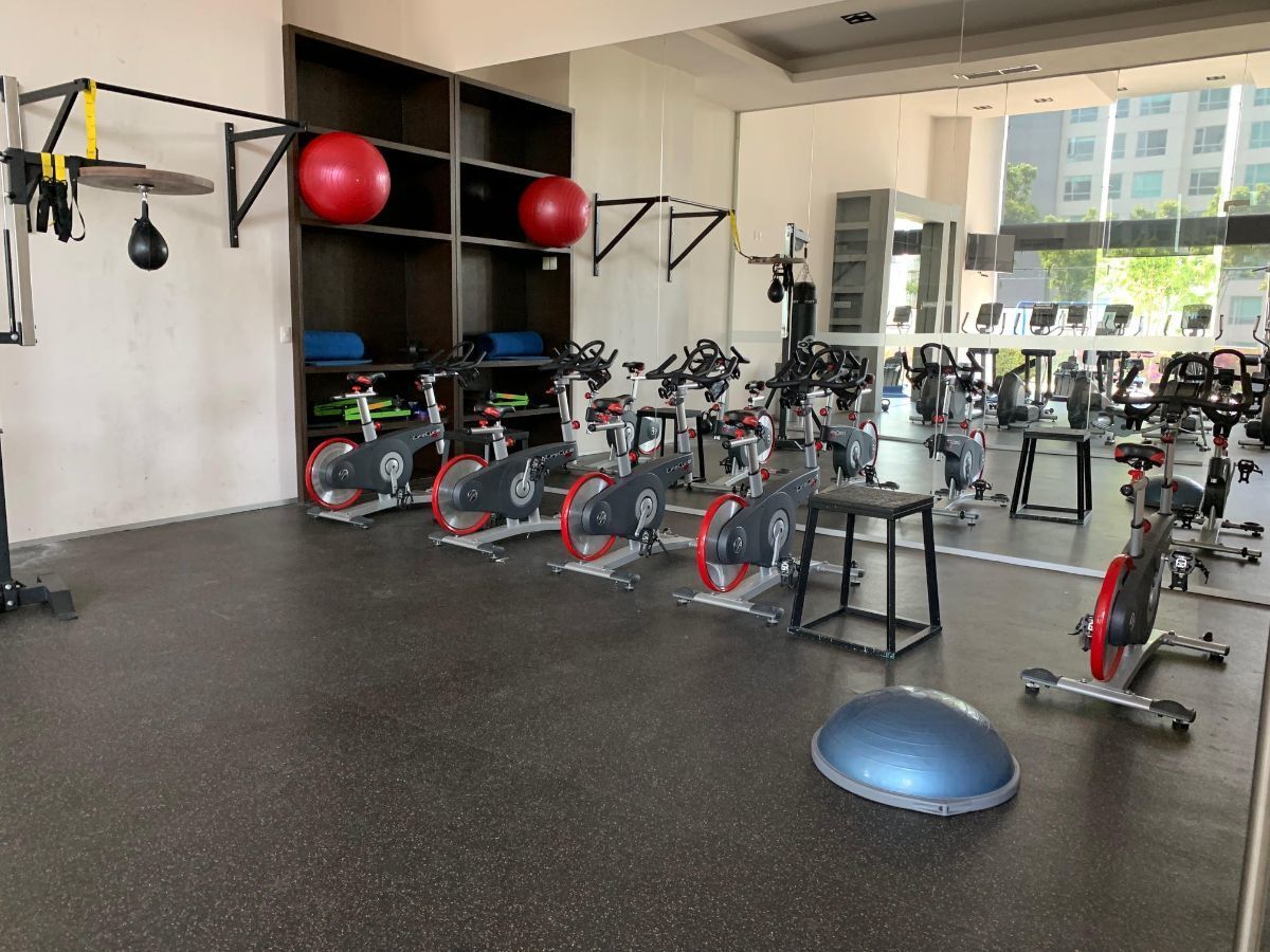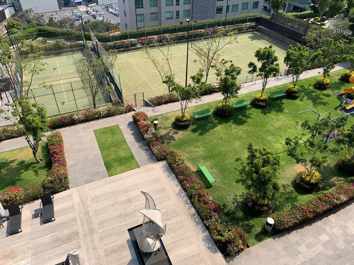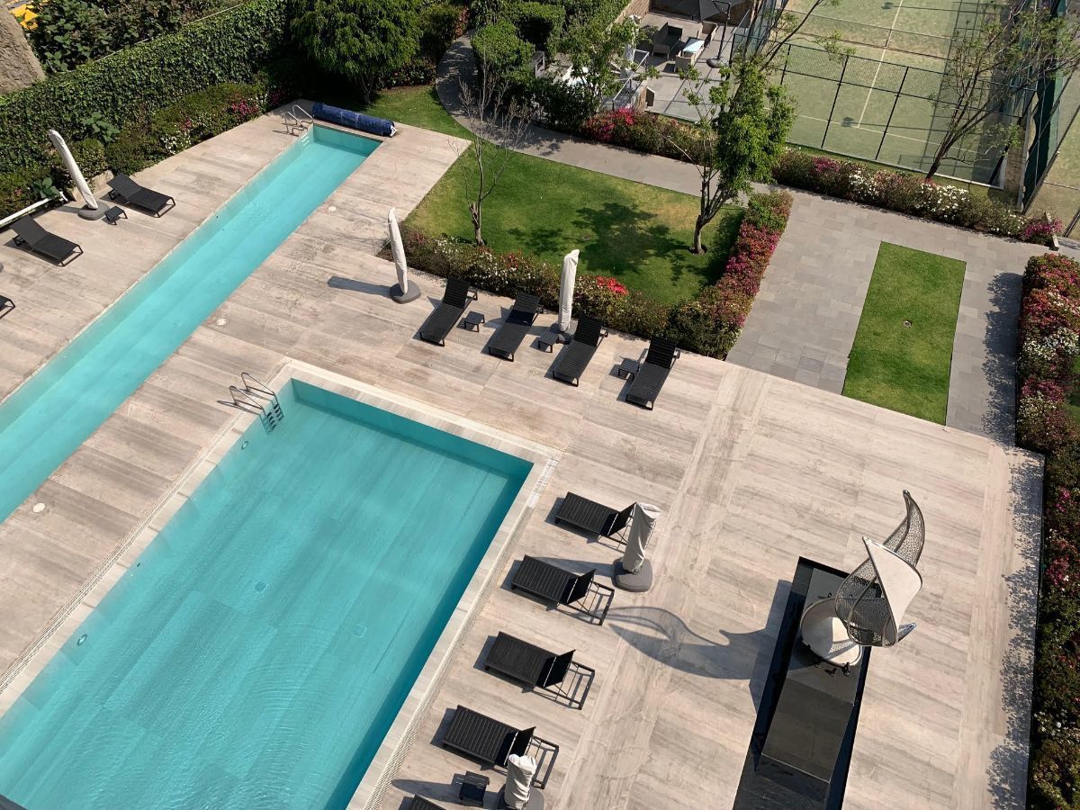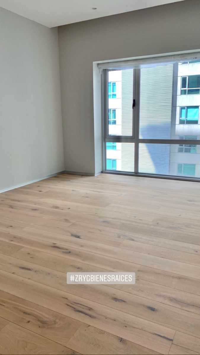 El departamento de 285m2 se distribuye en área de sala, comedor, cocina con barra y antecomedor, tres recamaras con vestidor y baño, cuarto de servicio integrado y área de lavado. Incluye tres cajones de estacionamiento y una bodega.