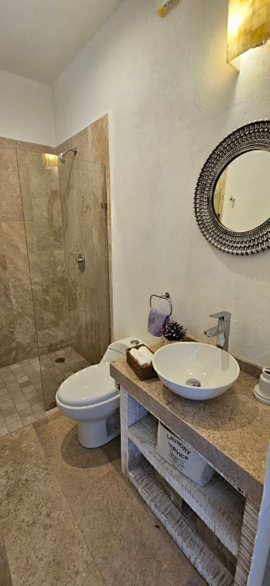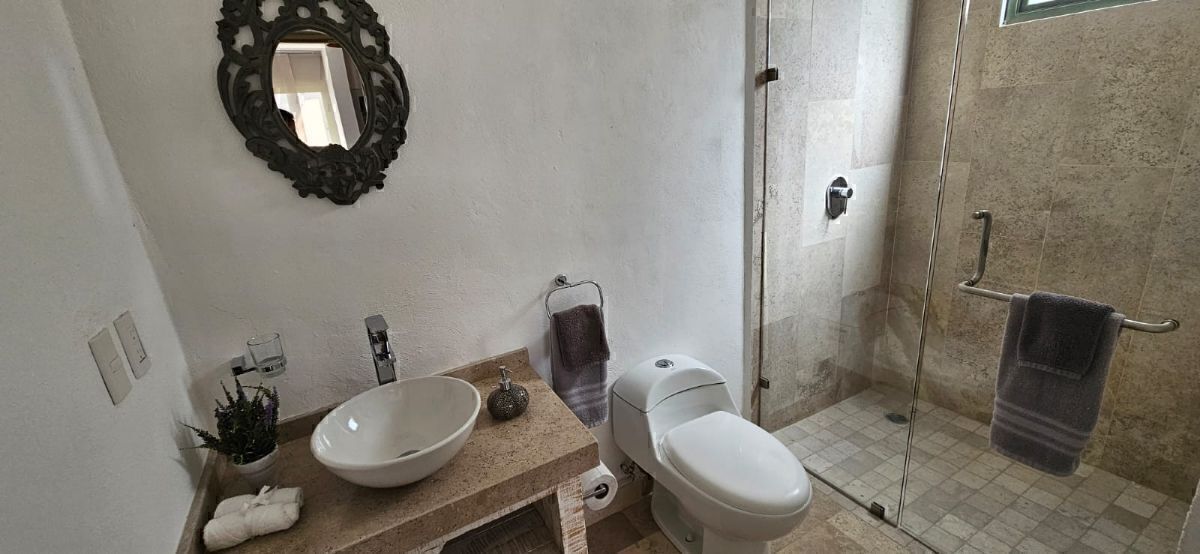 **2 baños completos con canceles de baño y mueble de lavabo.