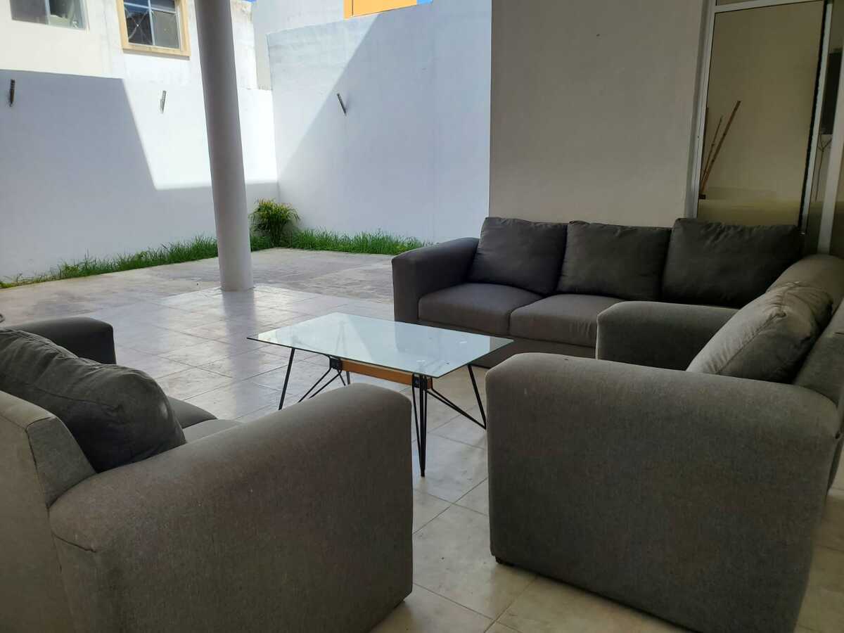 ✅ Patio trasero con sala y mesa para exterior + pasillo lateral con reja.