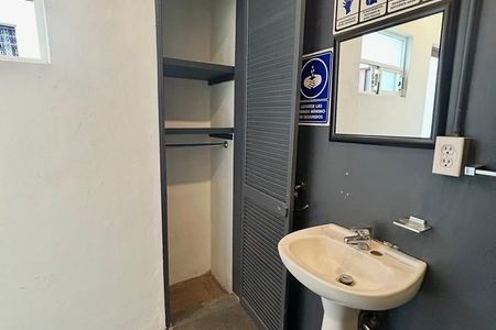 Cuenta con baño completo con un diseño único, ya que el lavabo fue diseñado en terrazzo de color rosa, piso de concreto y cancelaría de herrería.