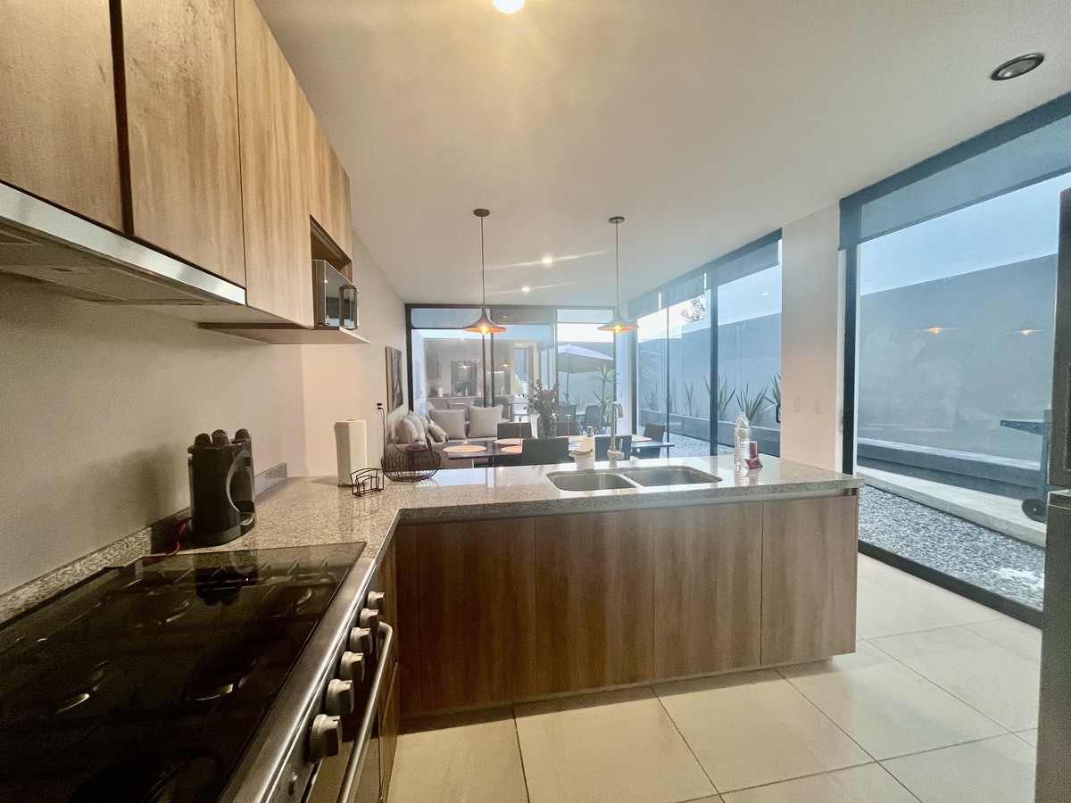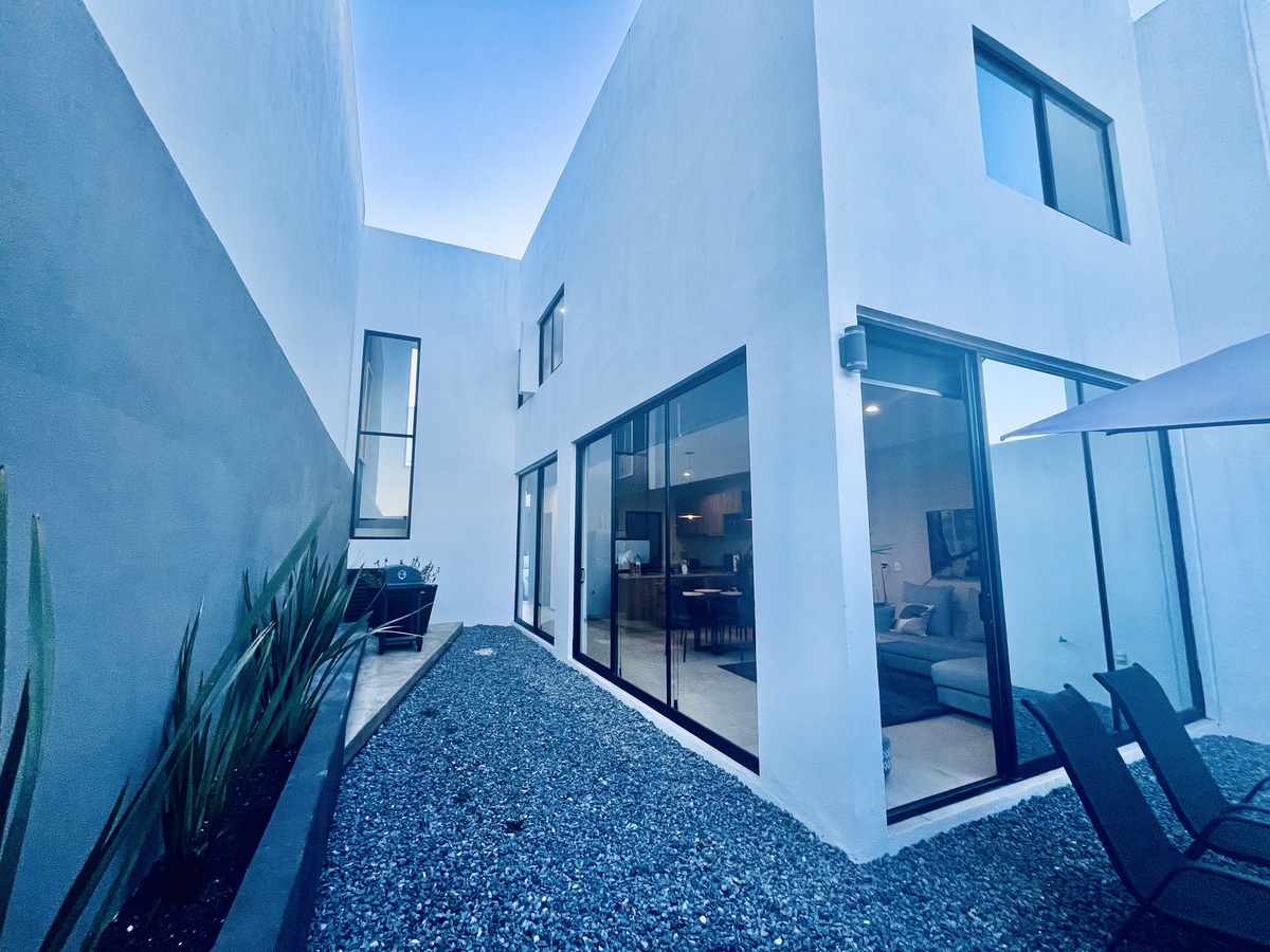 Te ofrece cocina amplia totalmente equipada, comedor y sala abiertos con vista a un jardín lateral y un jardín posterior.
