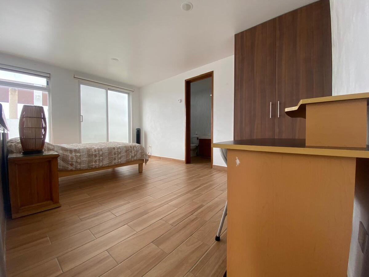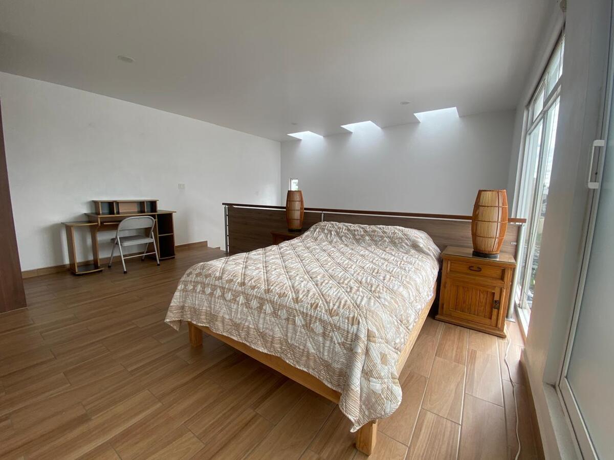 En el segundo nivel tienes una amplia habitación con una cama matrimonial, un closet, un mueble tipo escritorio y un baño completo para tu total privacidad.