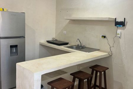 -Cocineta con barra, Pequeño refrigerador (así se entrega como las fotos, de ese tamaño), parrilla de gas con dos quemadores el gas está incluido y pequeña área de lavado en exterior.
