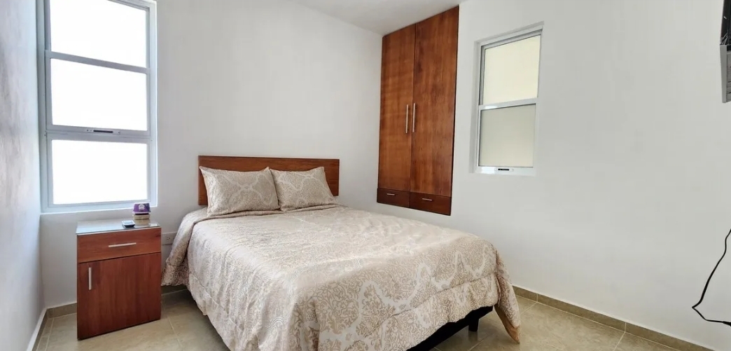 Consta de: -1 Recamara separada con mini split, 1 cama matrimonial, buro, TV y 1 baño completo amplio. todas las ventanas con mosquiteros. EL CLOSET ES PEQUEÑO