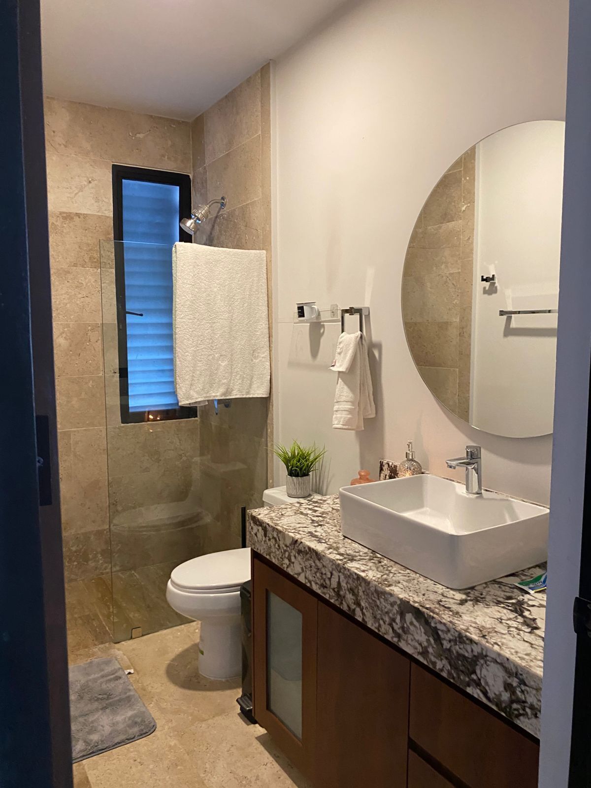 El departamento se renta amueblado y equipado, con aires acondicionados en todas las áreas. Cuenta con dos recámaras, dos baños completos, terraza y una cocina con barra desayunadora que cuenta con parrilla de inducción, lavadora, refrigerador y muebles de sala ideal para disfrutar de la comodidad y funcionalidad.