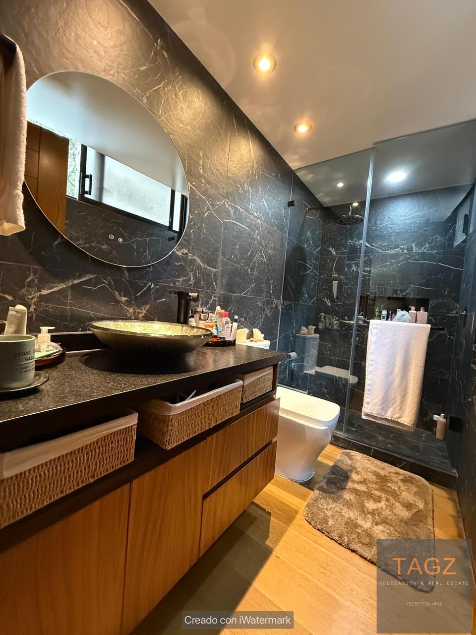 Son 3 recamaras, la principal con su vestidor y baño con placas de mármol y moderna grifería negro mate. Las otras 2 recamaras secundarias comparten un baño completo cin los mismos acabados. La recamara principal tiene ventana alemana cin doble vidrio.