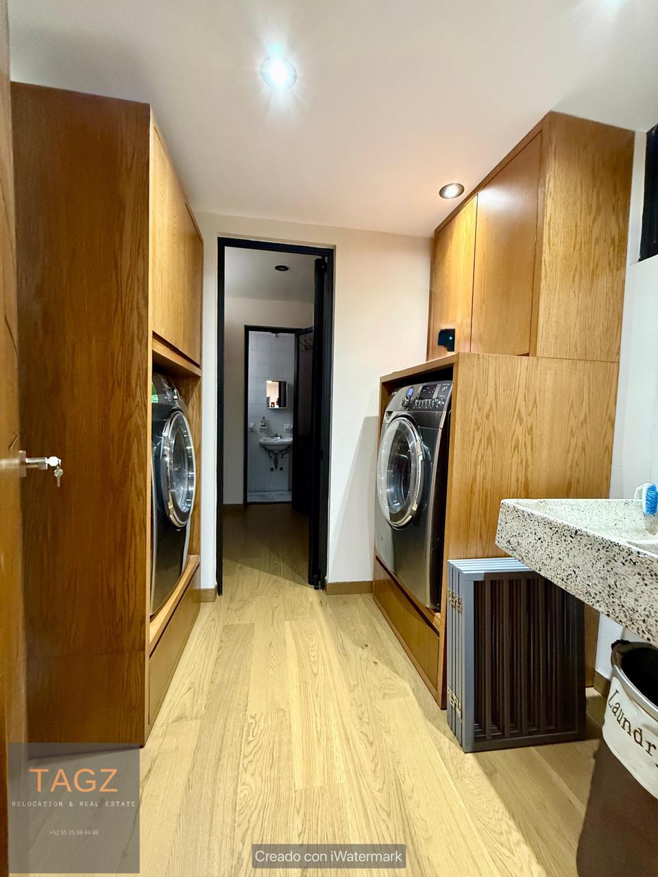 Lavandería super moderna incluye maquinas frontales casi nuevas y cuarto de servicio con mismo piso de madera del resto de la casa.