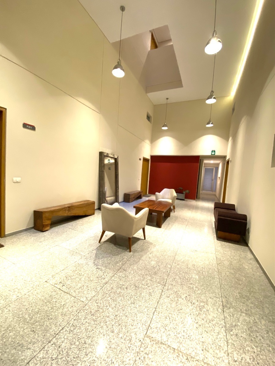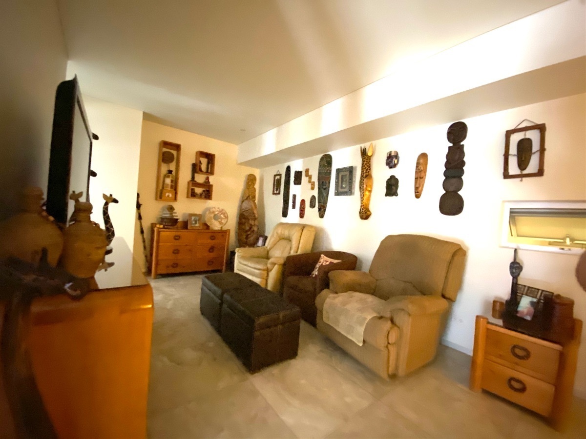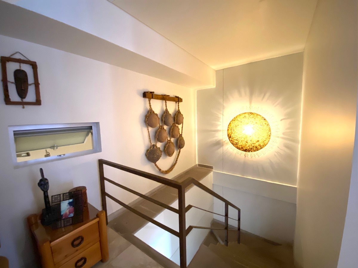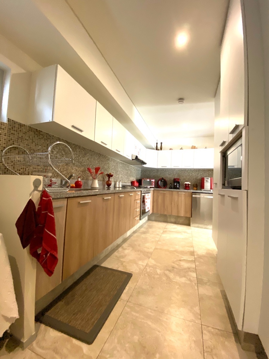 In PB: there is the very bright living room and dining room that overlooks the apartment's private garden, terrace with a weeping wall, a half bathroom, a very spacious kitchen with cupboard and laundry room.