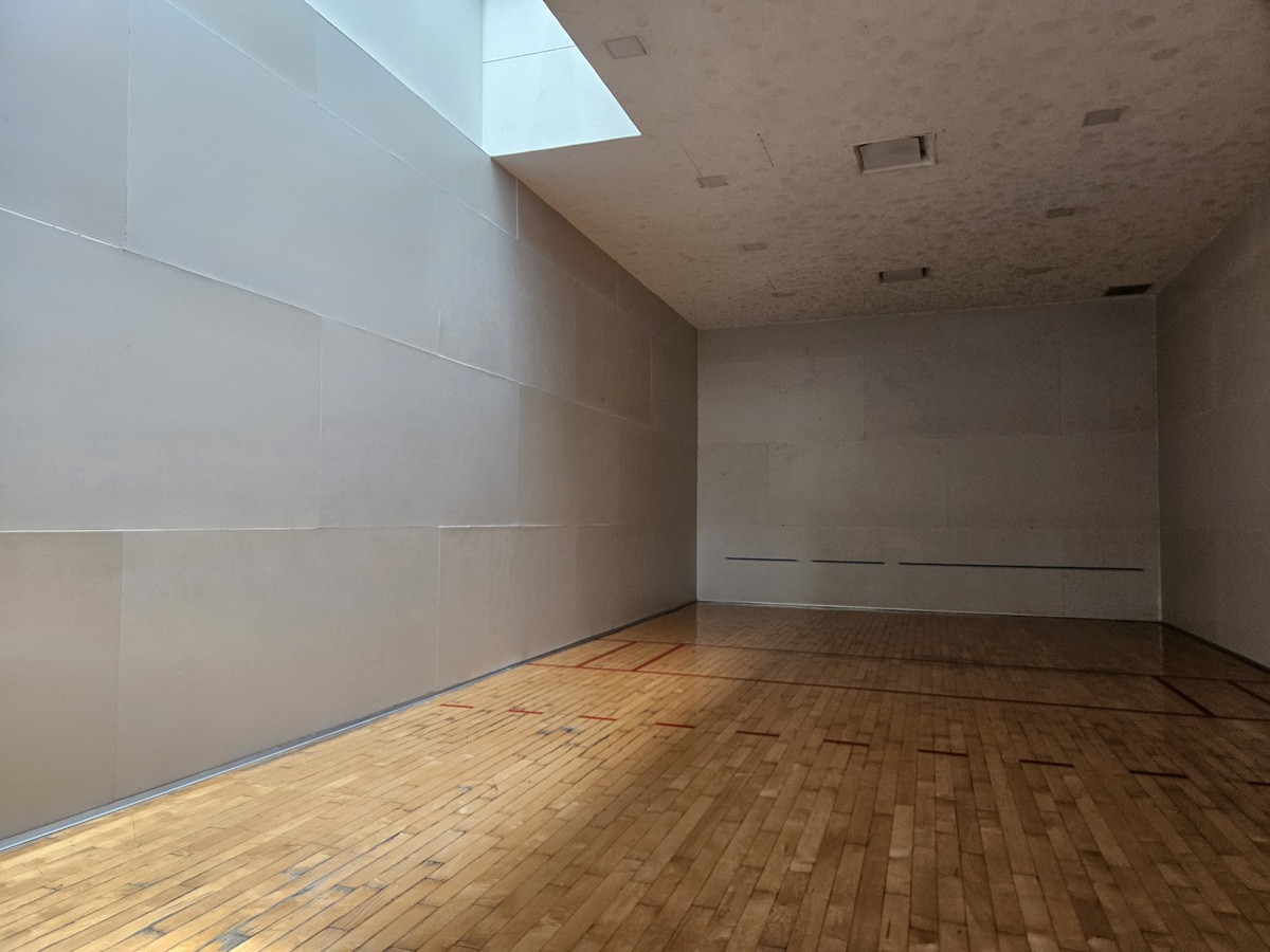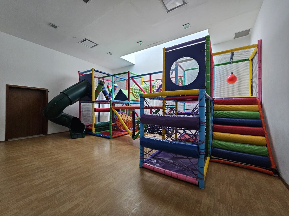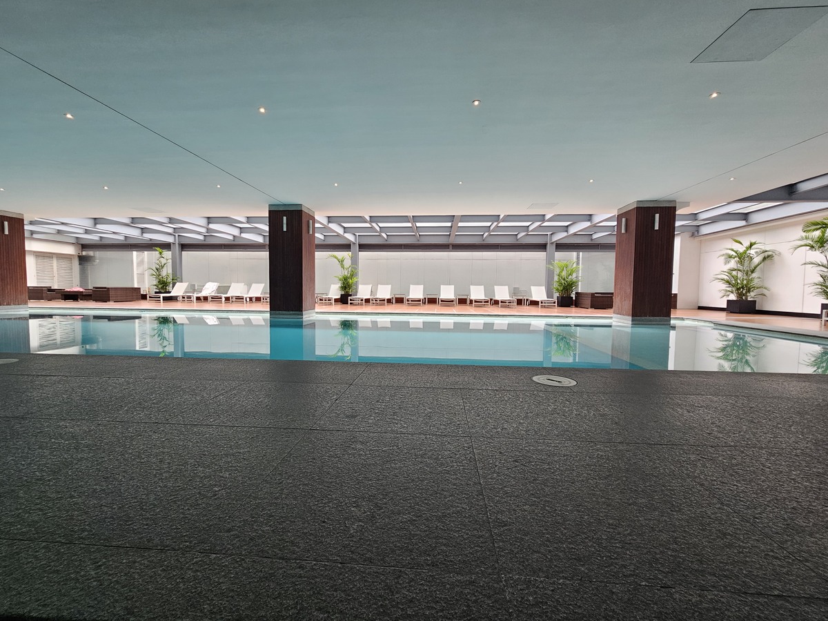 Alberca techada con chapoteadero y jacuzzi, camastros y baños para hombres y mujeres.