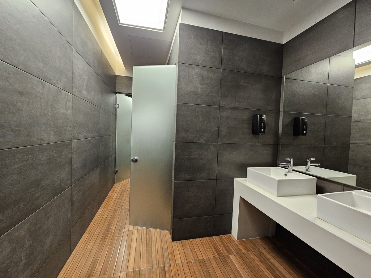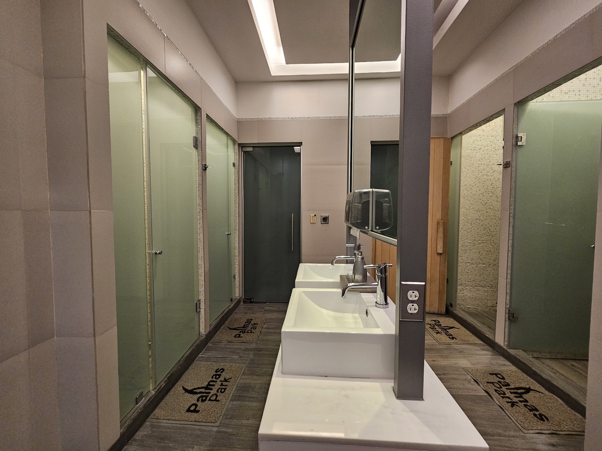 Spa para hombres y mujeres con regaderas, sauna, vapor y cabinas para masaje.