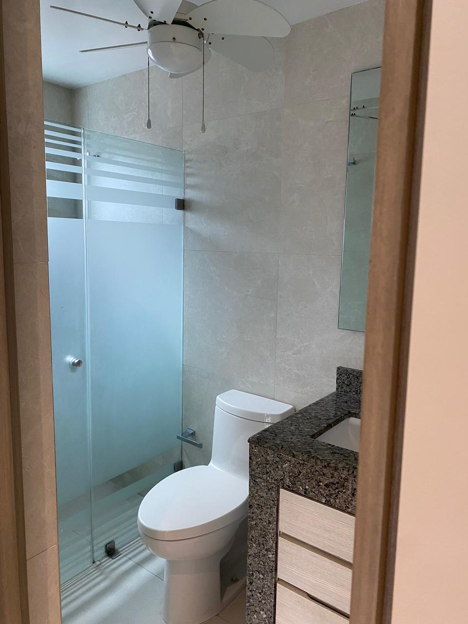 Baño: Lavabo con cubierta de granito, regadera con cancel de vidrio, ventilador de techo.