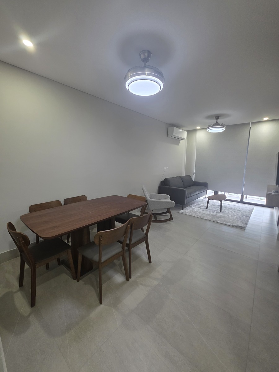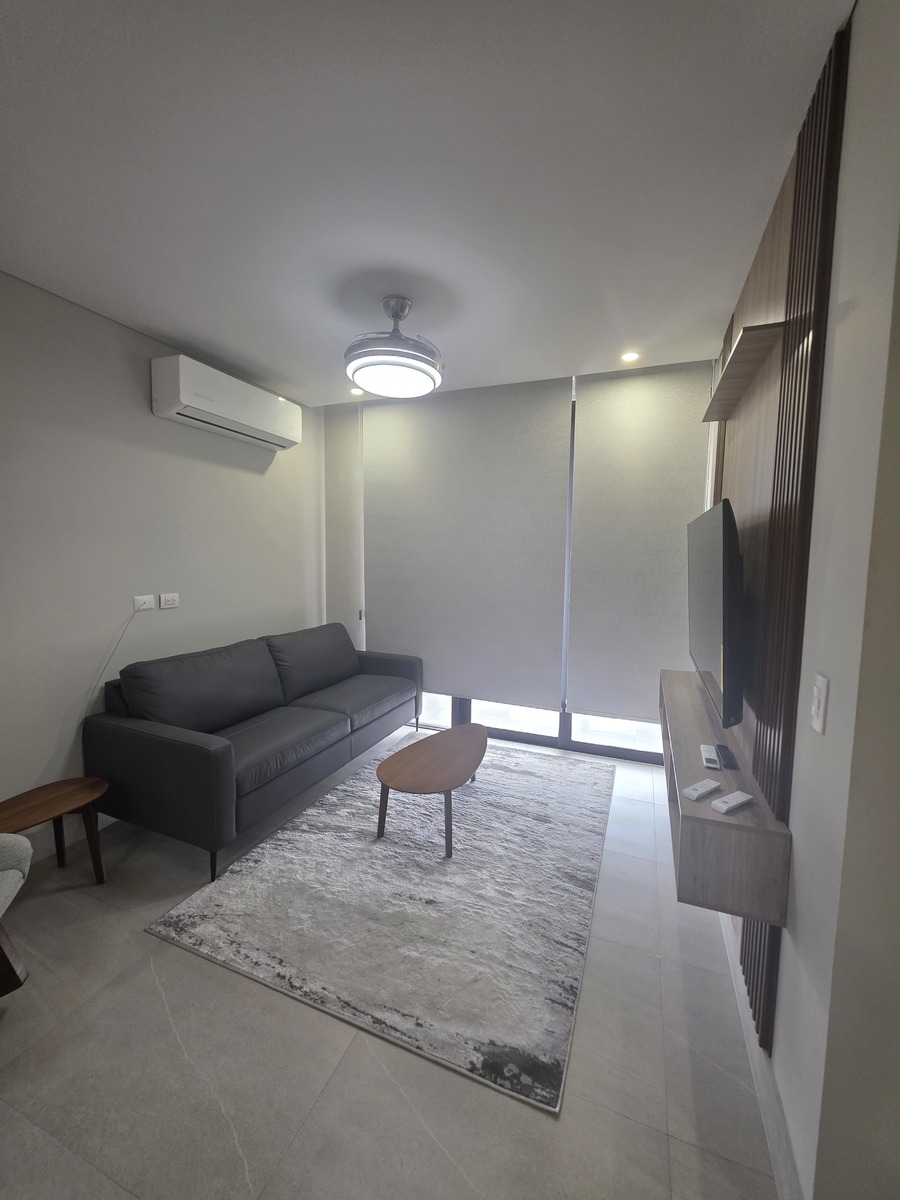 Departamento totalmente amueblado en Torre 1 Piso 9. Cuenta con cocina totalmente equipada con empotrables, área social con caba iluminada, pantalla plana y un balcón con hermosas vistas hacia el cerro de la silla.