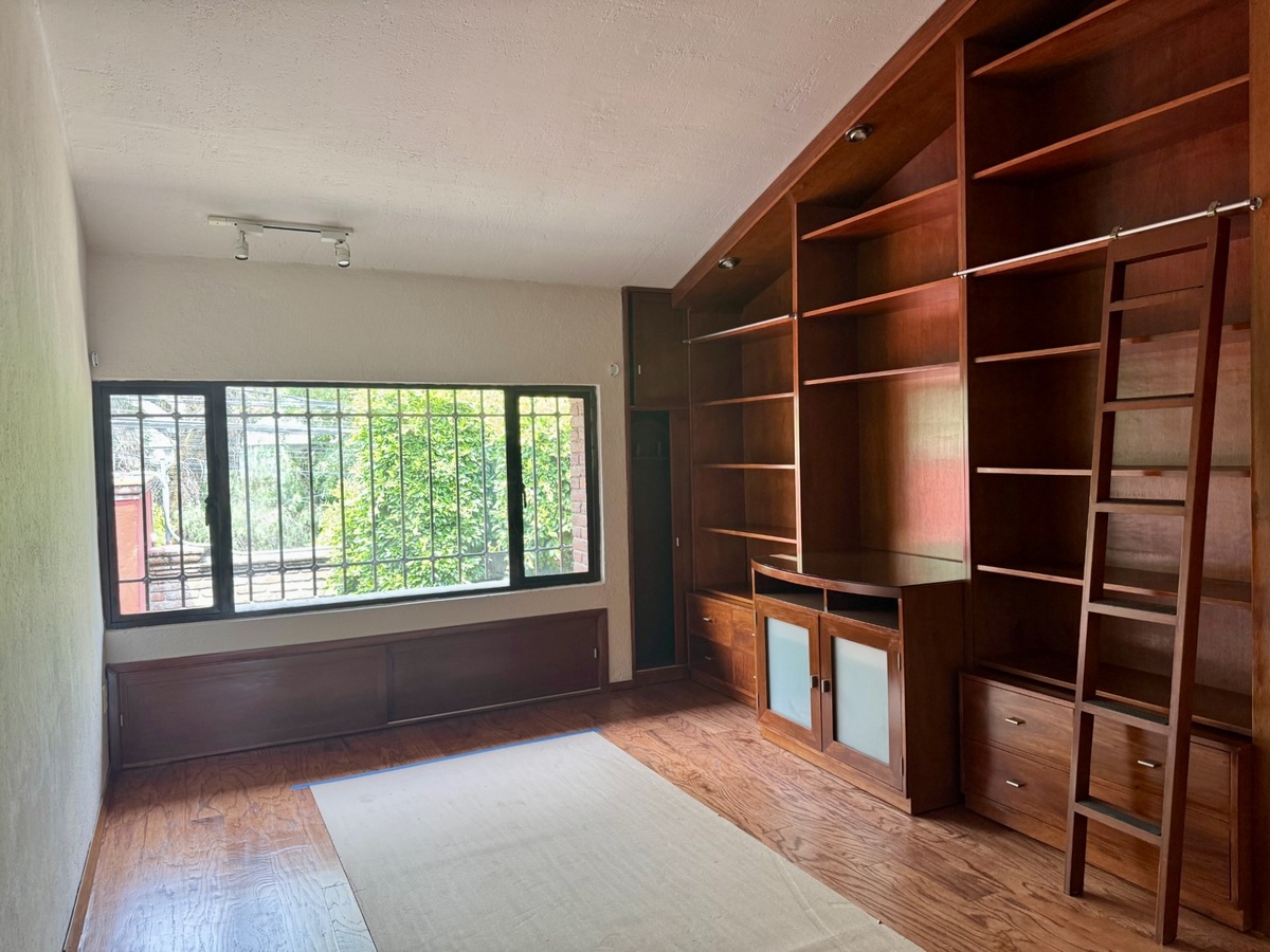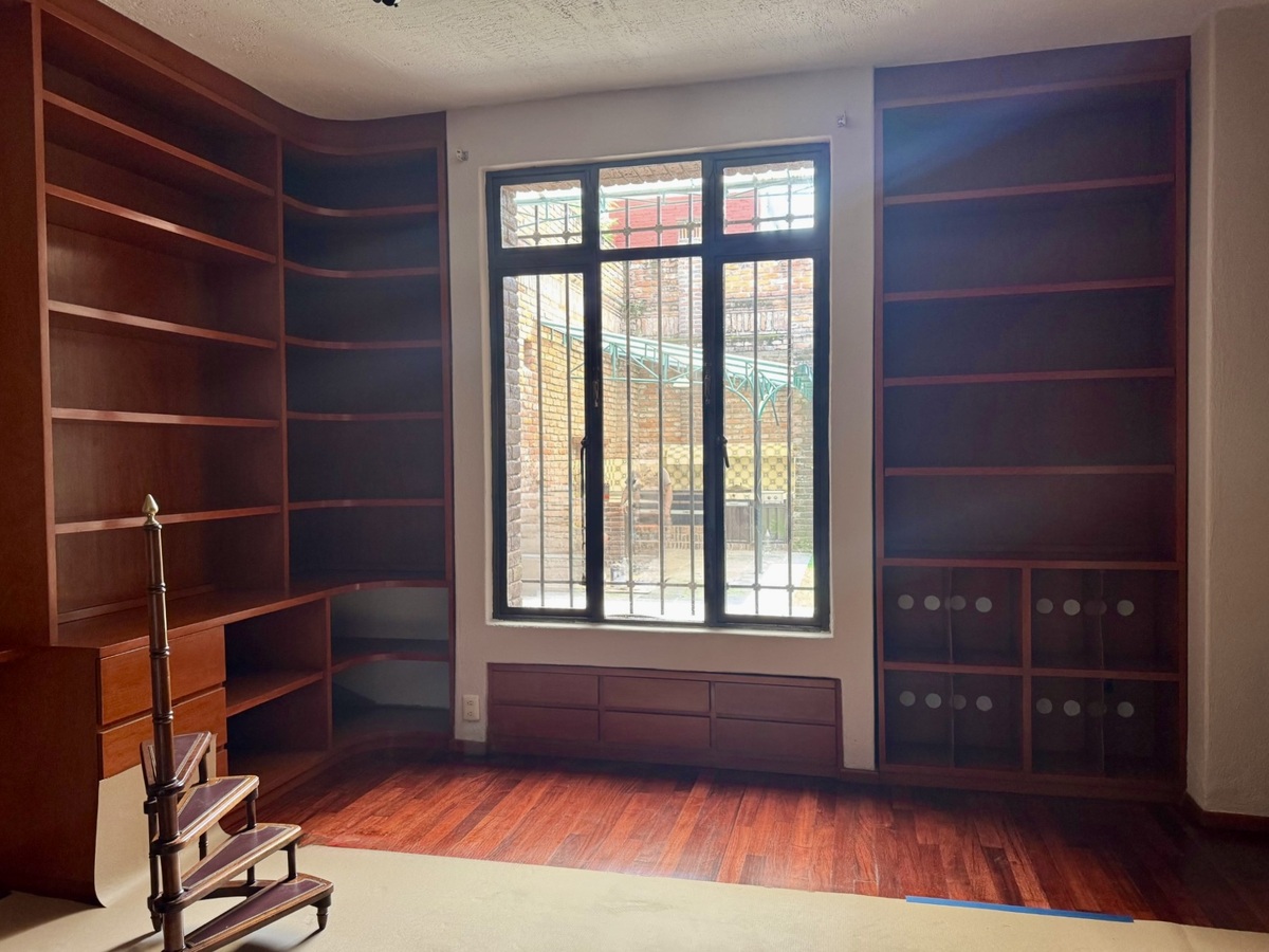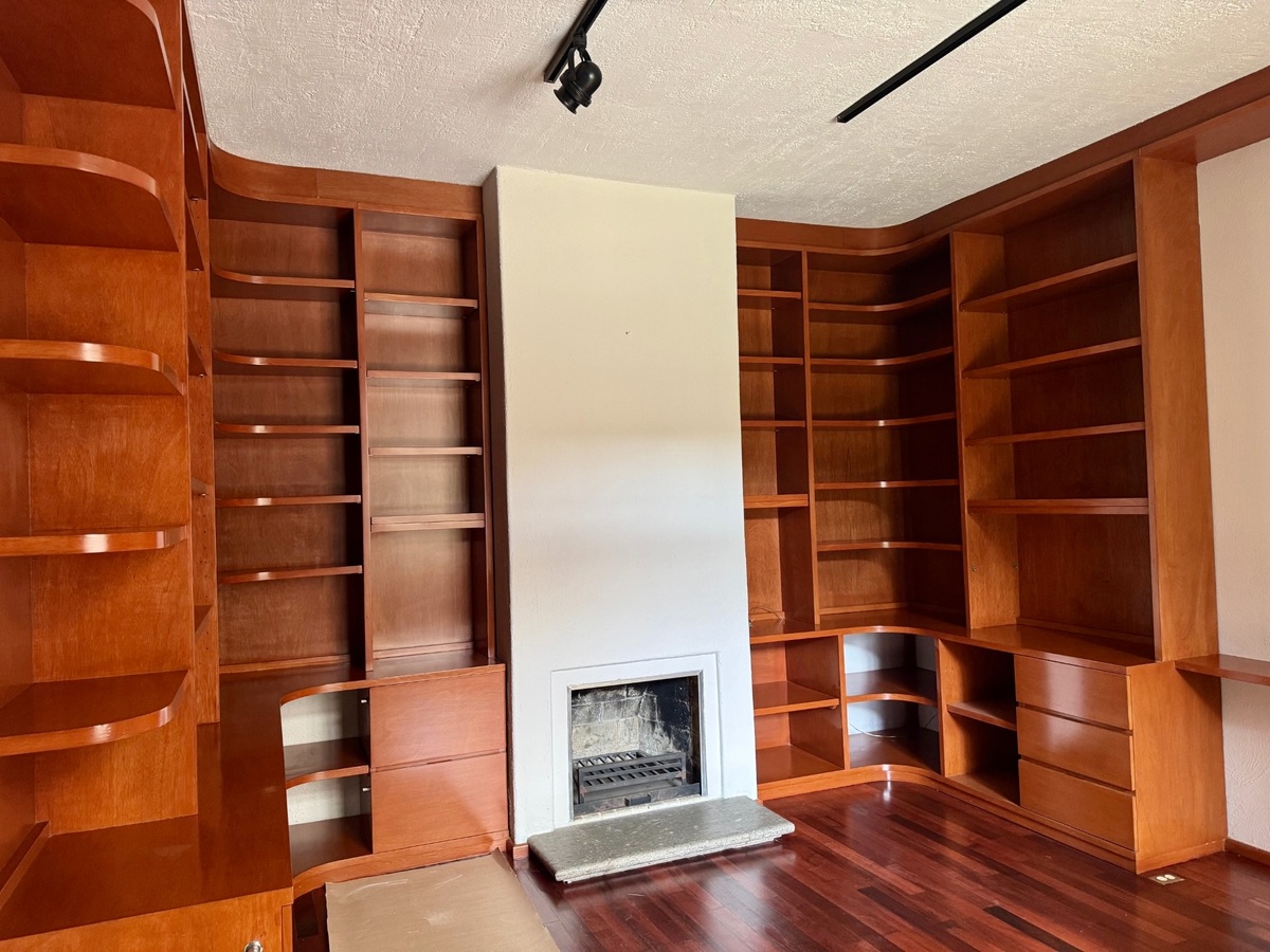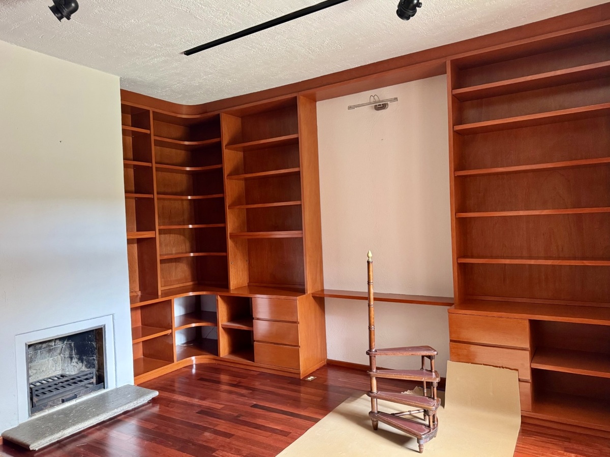 * Study-Library with bookshelves, wooden floors, and a fireplace with a window to the garden.