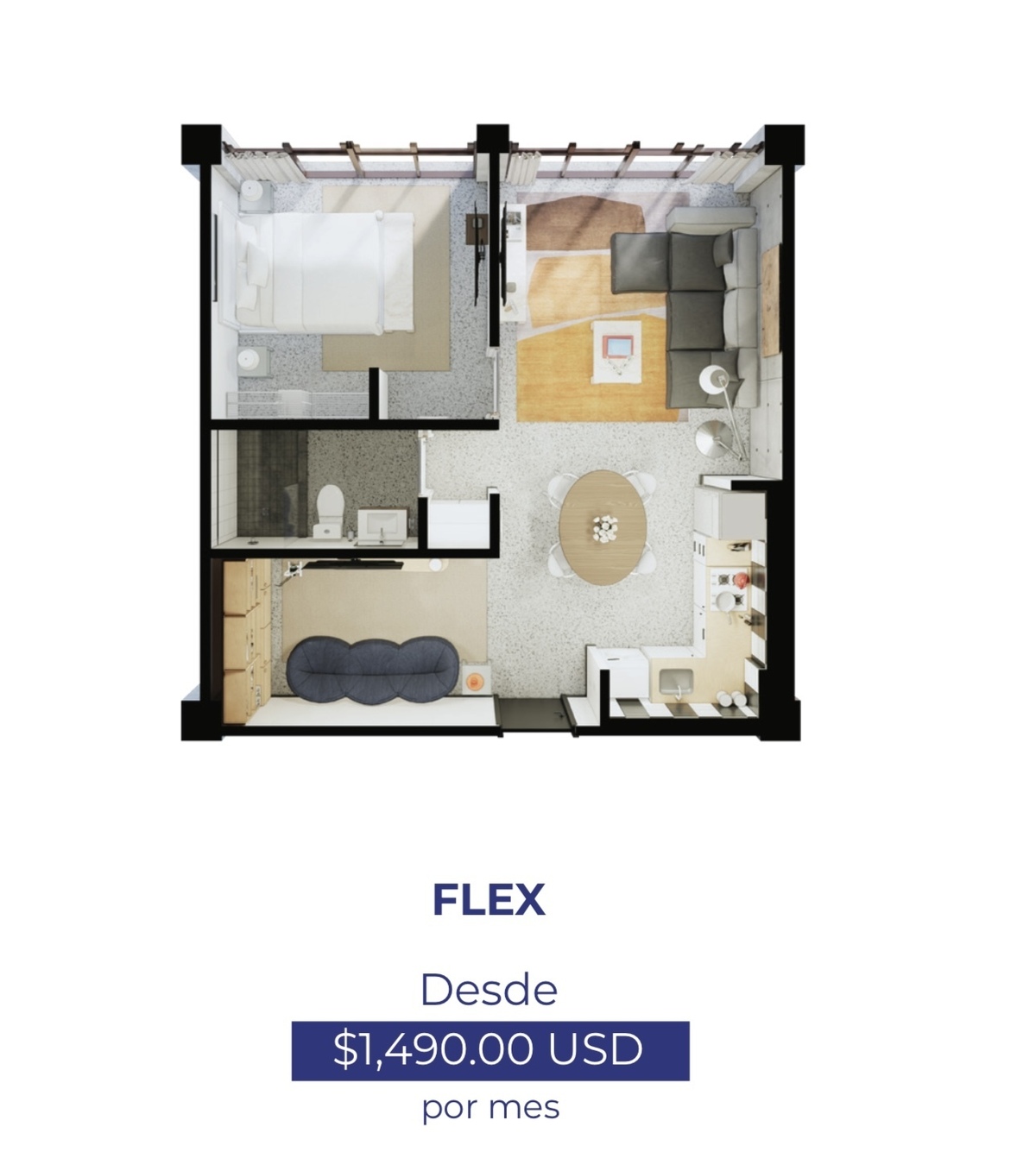 MODELO FLEX: 1 recamara. cocina, comedor, area flex