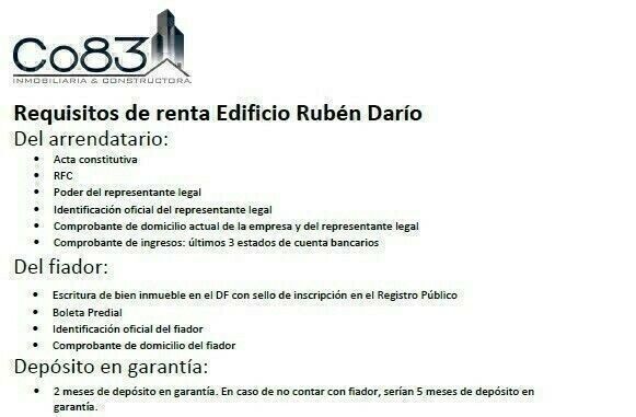 Requisitos: 1 mes de depósito en garantía, 1 mes de renta por adelantado, seguro de responsabilidad civil y fiador con bien inmueble libre de gravamen en CDMX.