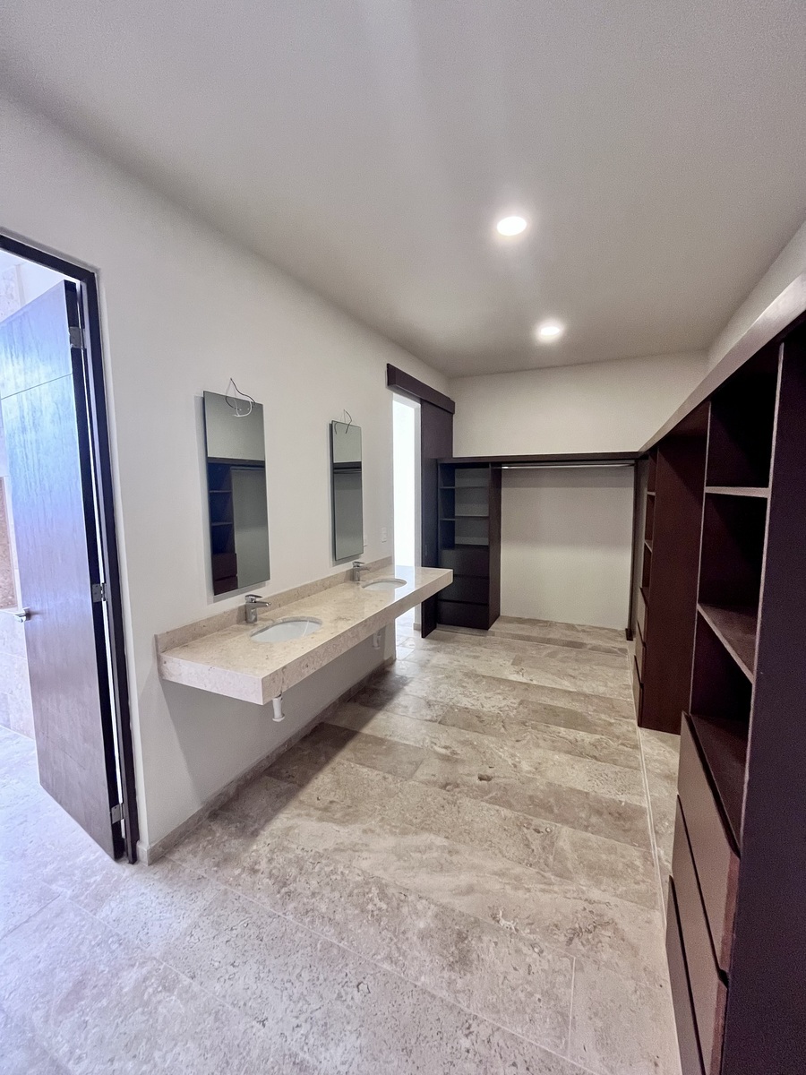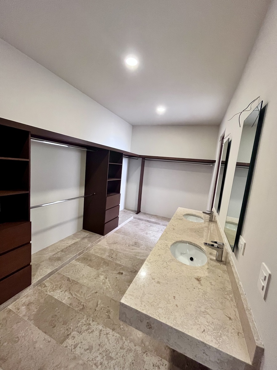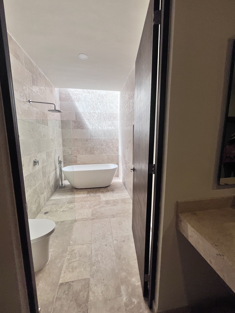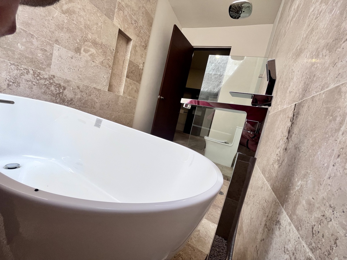 • Recámara principal con clóset vestidor, tina, área de lavabos independiente y zona de ducha + inodoro separada.