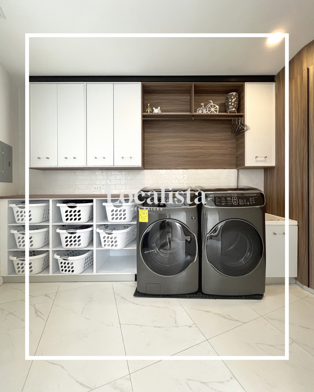 - Lavandería en planta alta equipada con lavadora y secadora, gabinetes, area de lavado