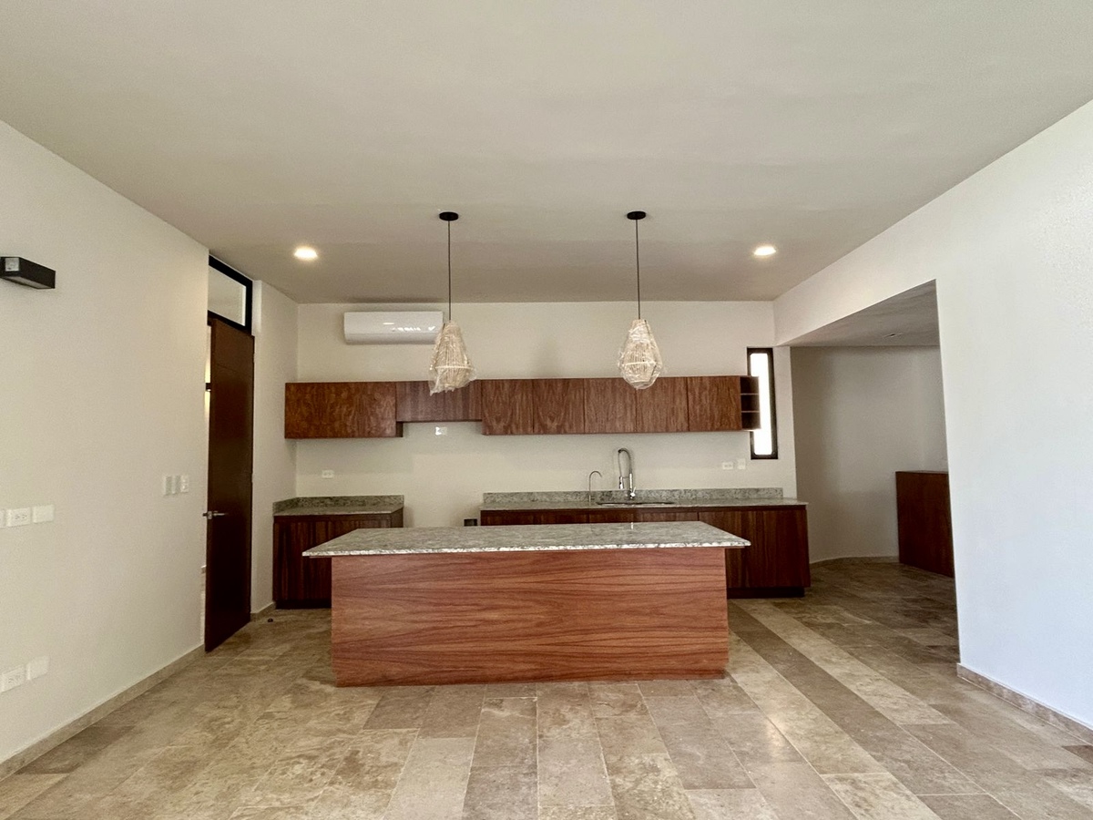• Cocina equipada con isla, gavetas en madera, alacena y meseta de granito.
