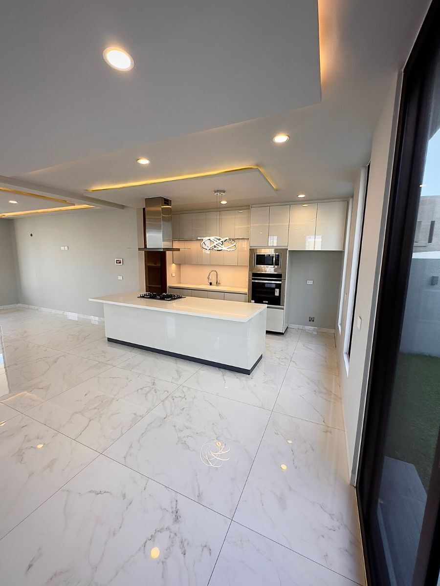 equipada con cubierta de Cuarzo y con horno, parrilla, campana y horno microondas marca io mabe, dobletarja y amplia despensa.