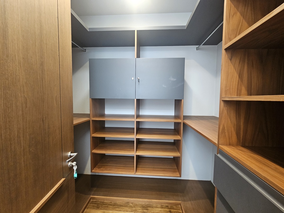 - Master bedroom with private TV area, full bathroom, balcony, and large walk-in closet