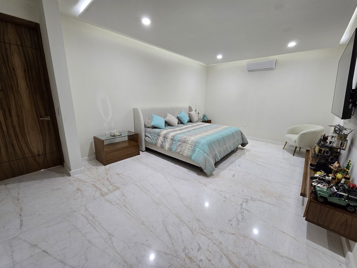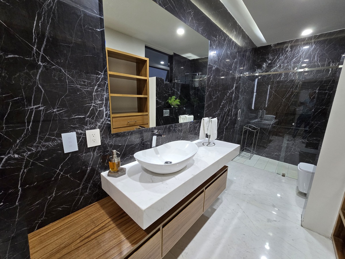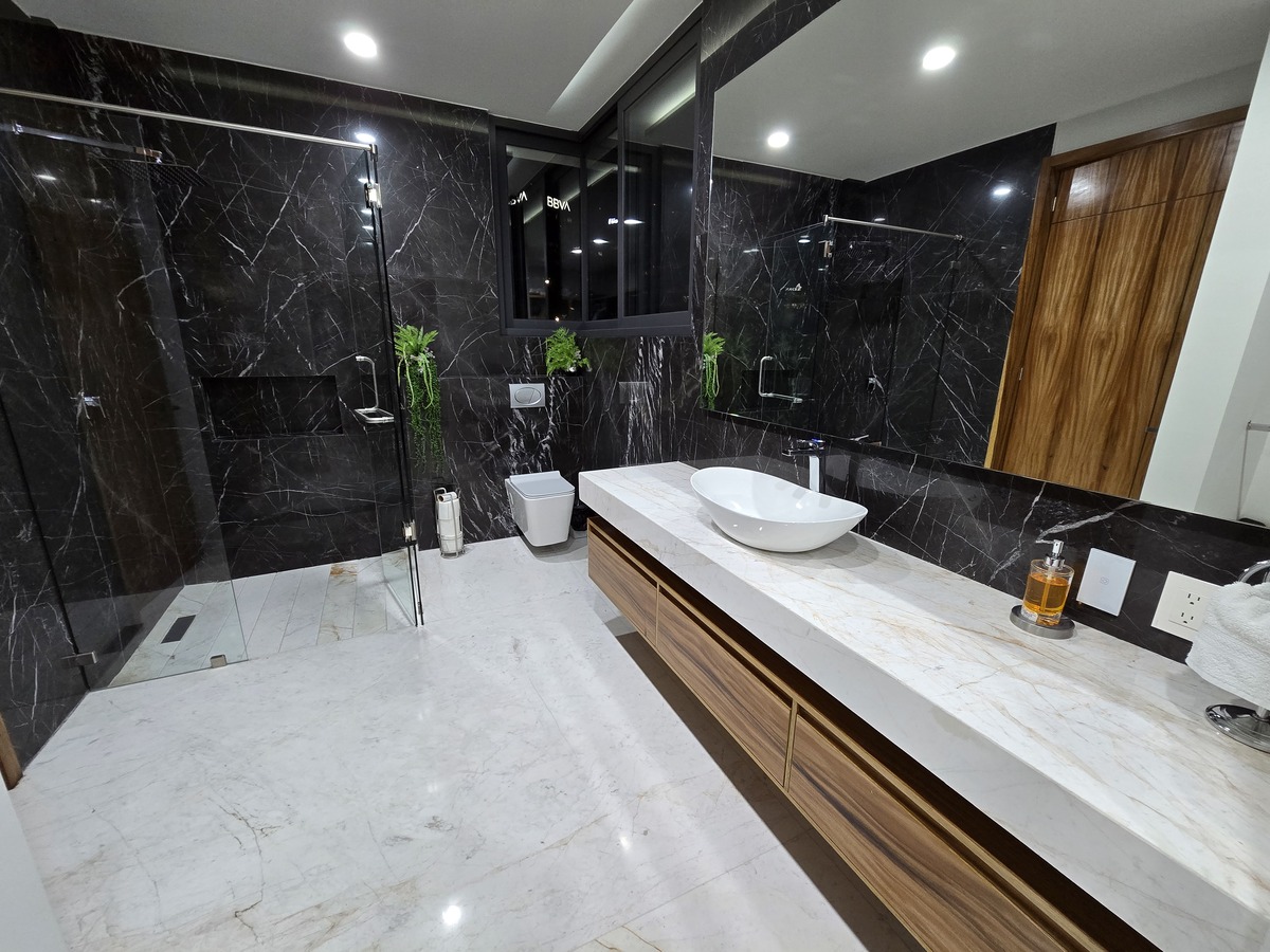 Una escalera de mármol negro con celosía de madera conduce a la planta alta, donde un pasillo con vista a la doble altura conecta las recámaras. Cada una cuenta con baño completo y vestidor, además de una atmósfera cálida y elegante. Este nivel también ofrece una acogedora sala de TV ideal para momentos familiares.